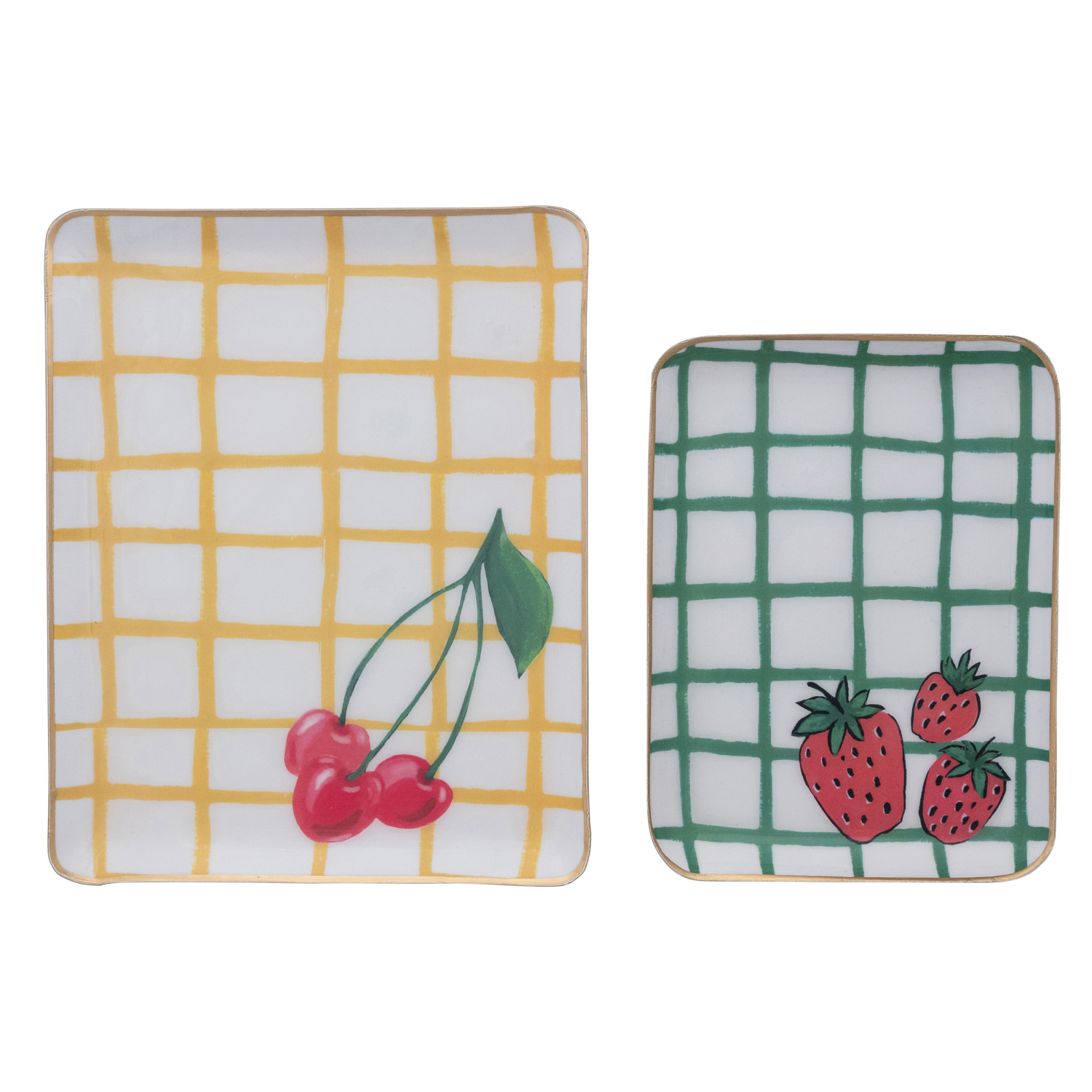 Catalog Name: 10"L x 8"W & 8"L x 6"W Enameled Metal Trays w/ Grid Pattern, Cherries/Strawberries & Gold Edges, Multi Color, Set of 2 ©