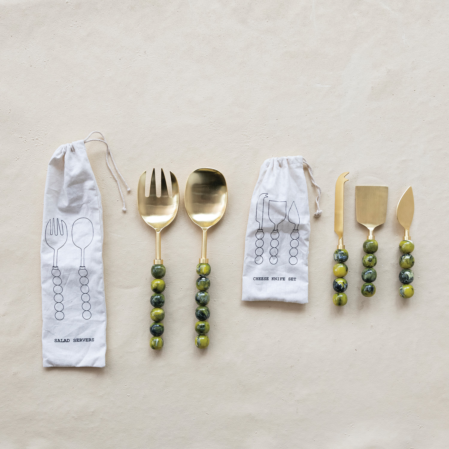 Catalog Name: 6-3/4"L - 8"L Stainless Steel Cheese Knives w/ Marbled Resin Ball Handles, Gold Finish & Green, Set of 3 in Printed Drawstring Bag (Each One Will Vary)