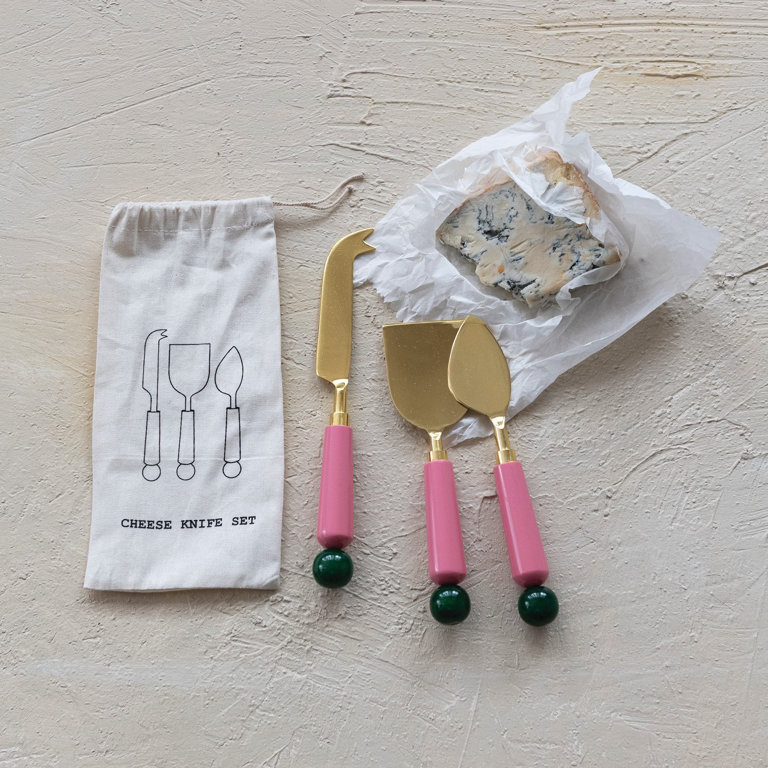 Stainless Steel Cheese Knives with Resin Handles, Gold Finish, Set of 3 in Drawstring Bag