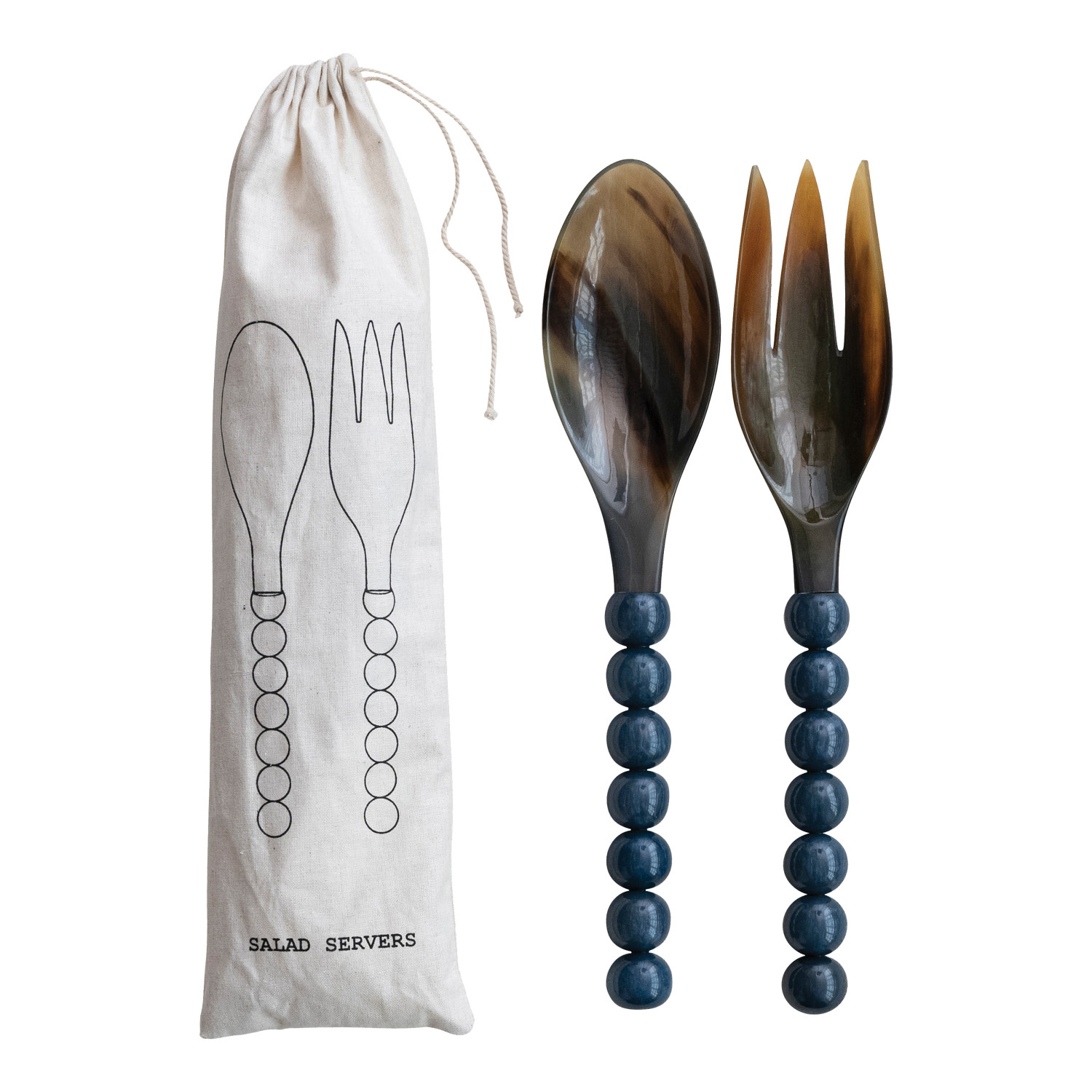 Catalog Name: 11-3/4"L Natural Horn Salad Servers w/ Marbled Resin Ball Handles, Blue, Set of 2 in Printed Drawstring Bag (Each One Will Vary)
