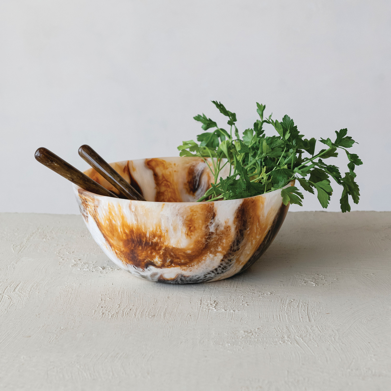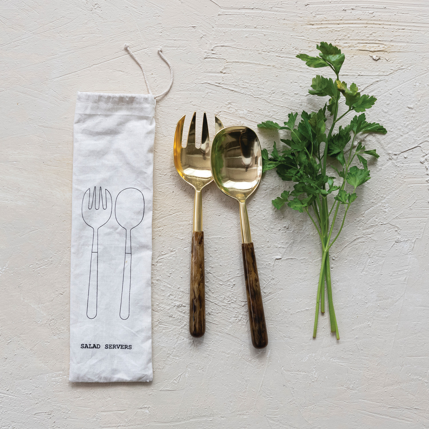 Catalog Name: 10-3/4"L Stainless Steel Salad Servers w/ Marbled Resin Handles, Gold Finish & Brown, Set of 2 in Printed Drawstring Bag (Each One Will Vary)