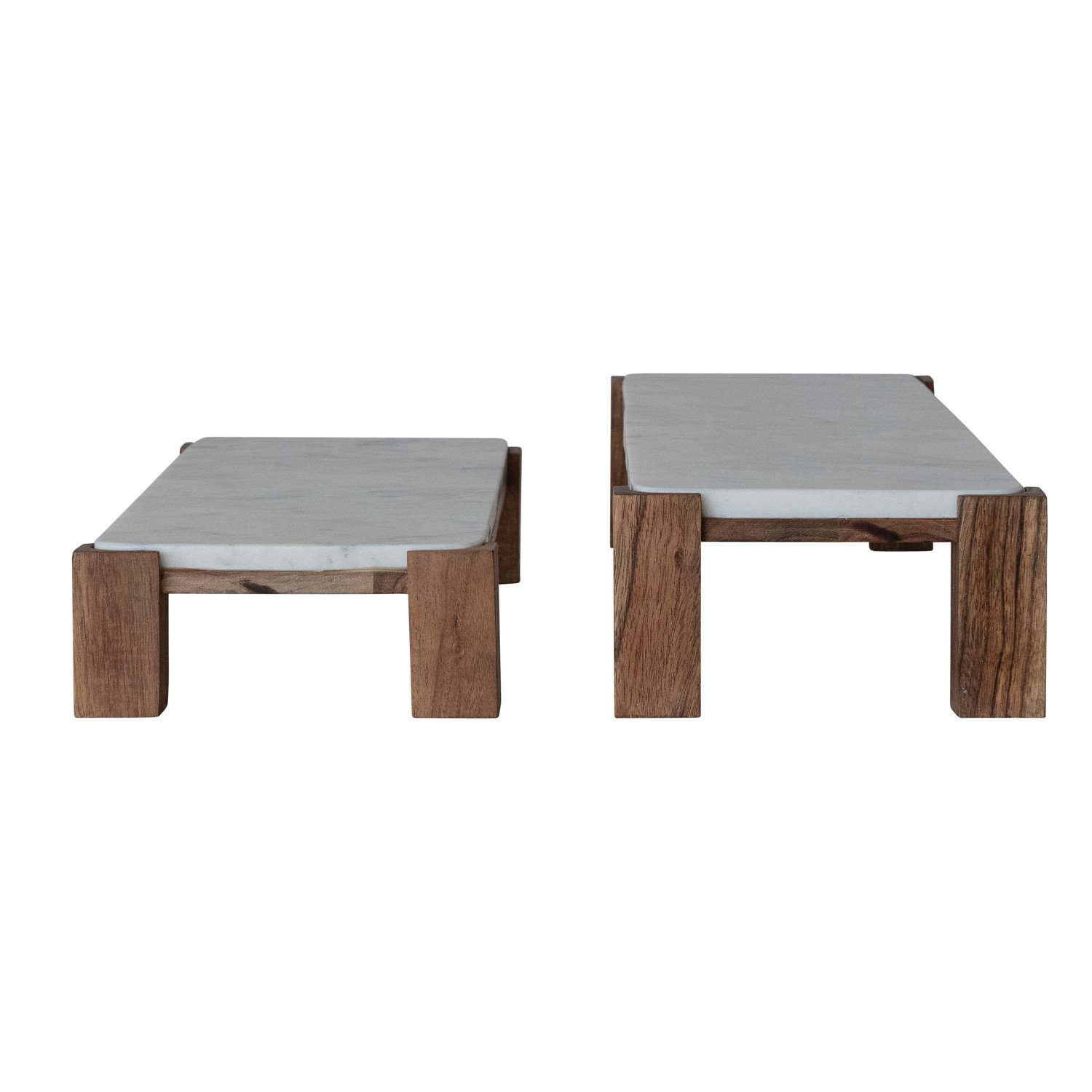 Catalog Name: 25-1/2"L x 7-1/2"W x 4"H & 19-1/4"L x 7-1/2"W x 3"H Marble & Acacia Wood Nesting Pedestals, White & Natural, Set of 2