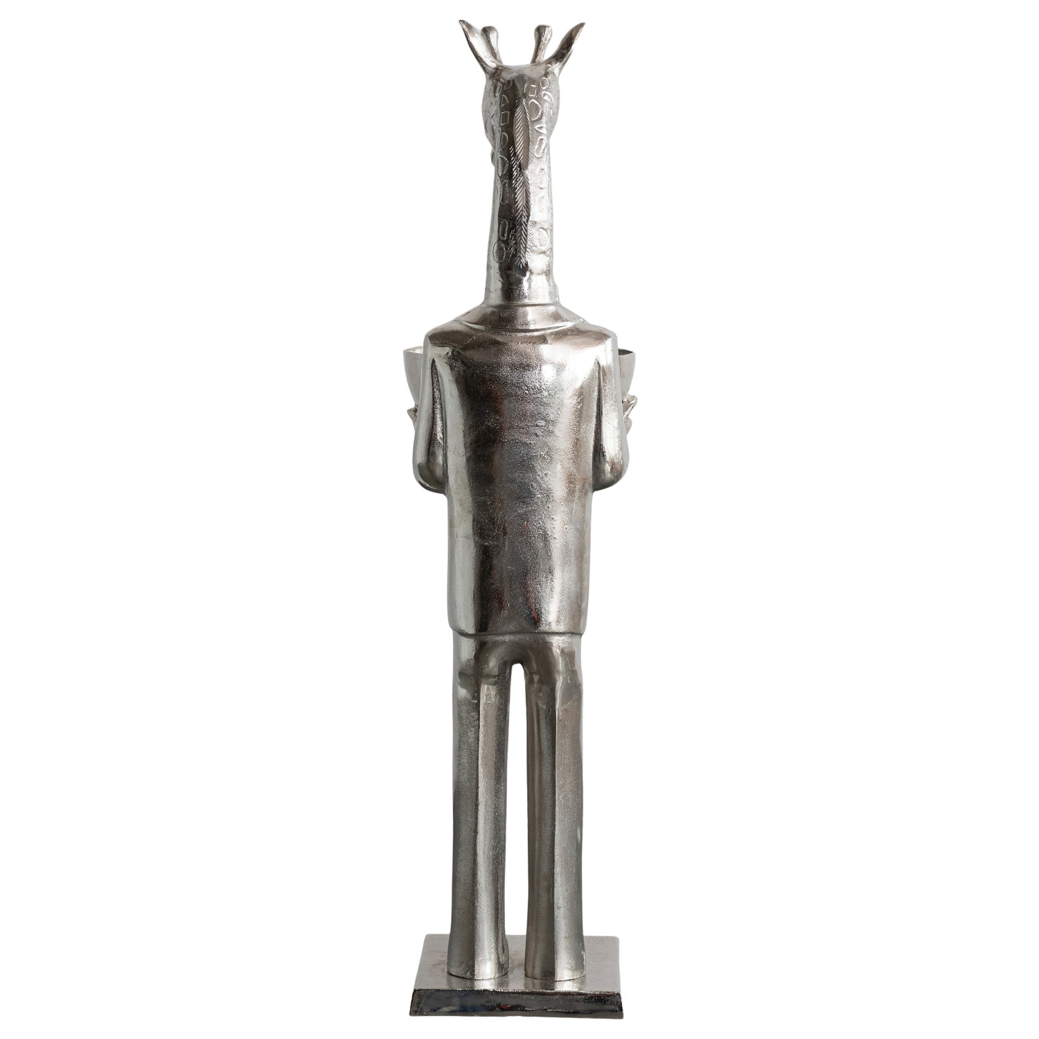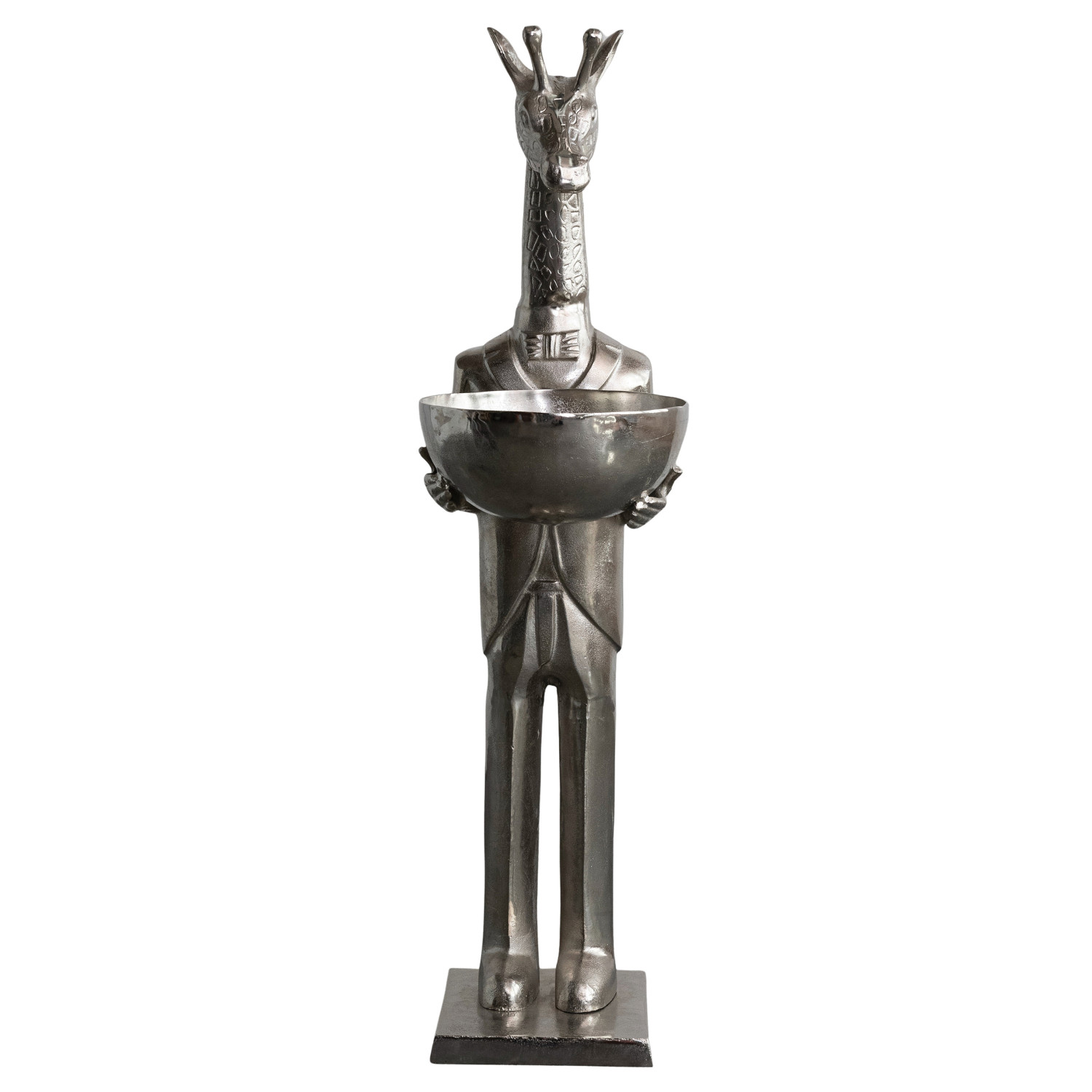 Catalog Name: 15"L x 23"W x 58"H Cast Aluminum Giraffe Butler Holding Bowl, Nickel Finish, Truck Ship