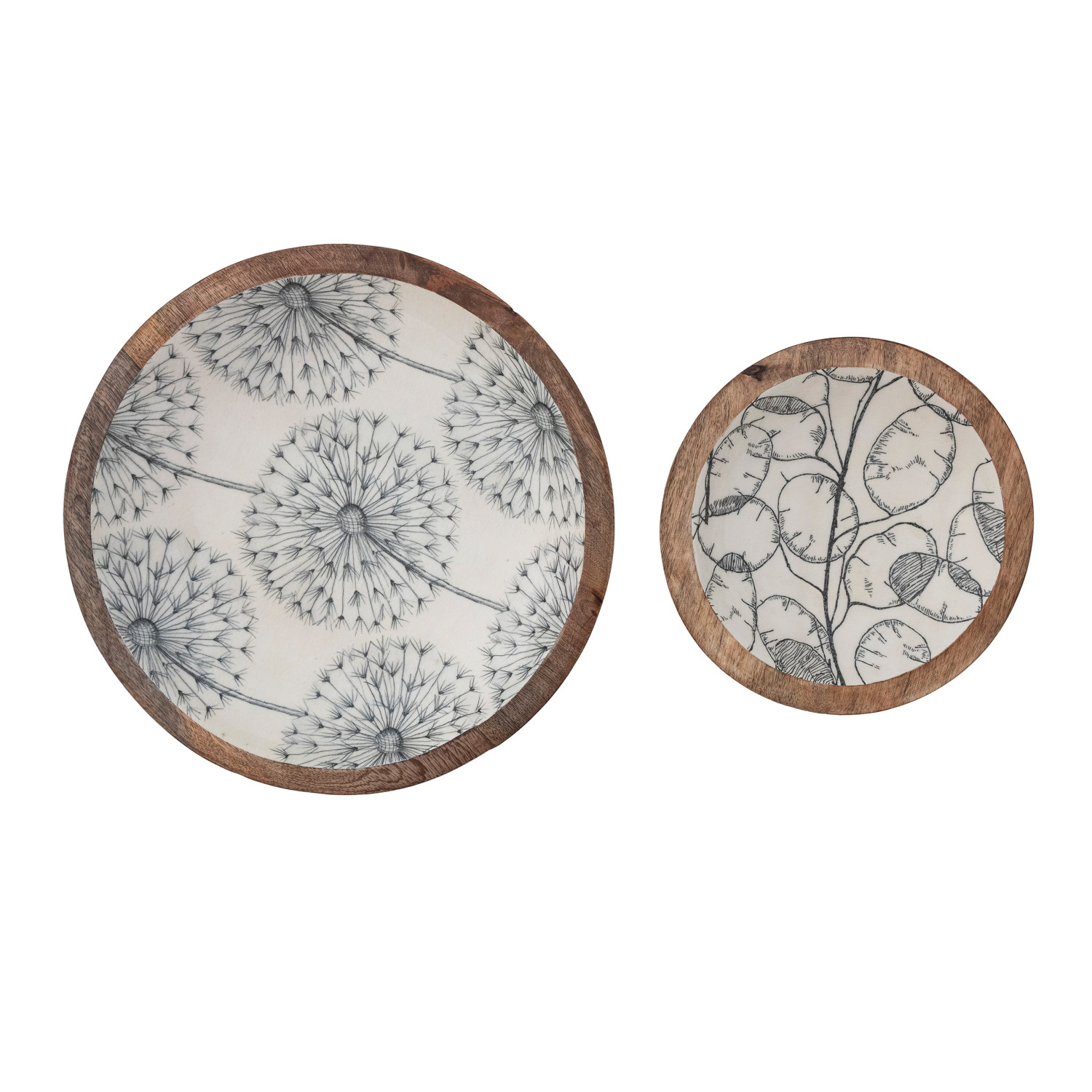 Catalog Name: 11-1/2" Round x 2-1/4"H & 8" Round x 2"H Enameled Mango Wood Bowls w/ Botanical Patterns, Cream Color & Grey, Set of 2