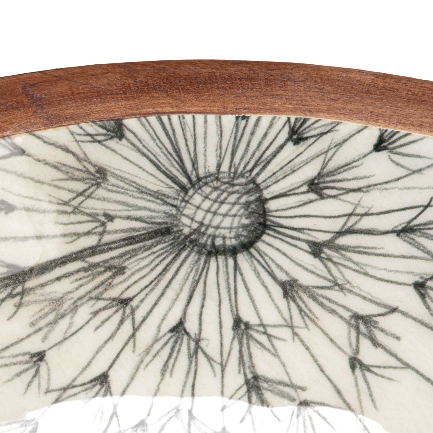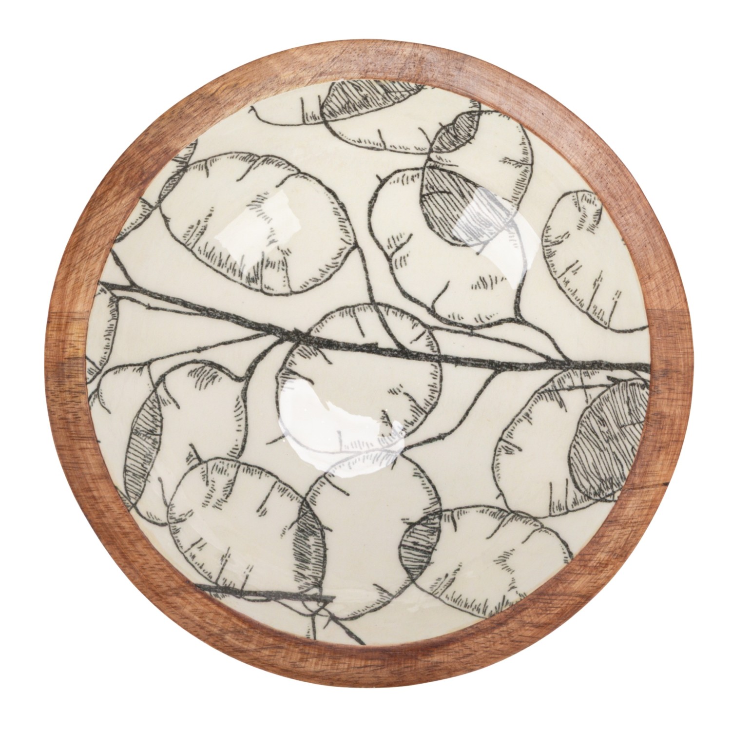Enameled Mango Wood Bowls with Botanical Patterns, Cream Color & Grey, Set of 2