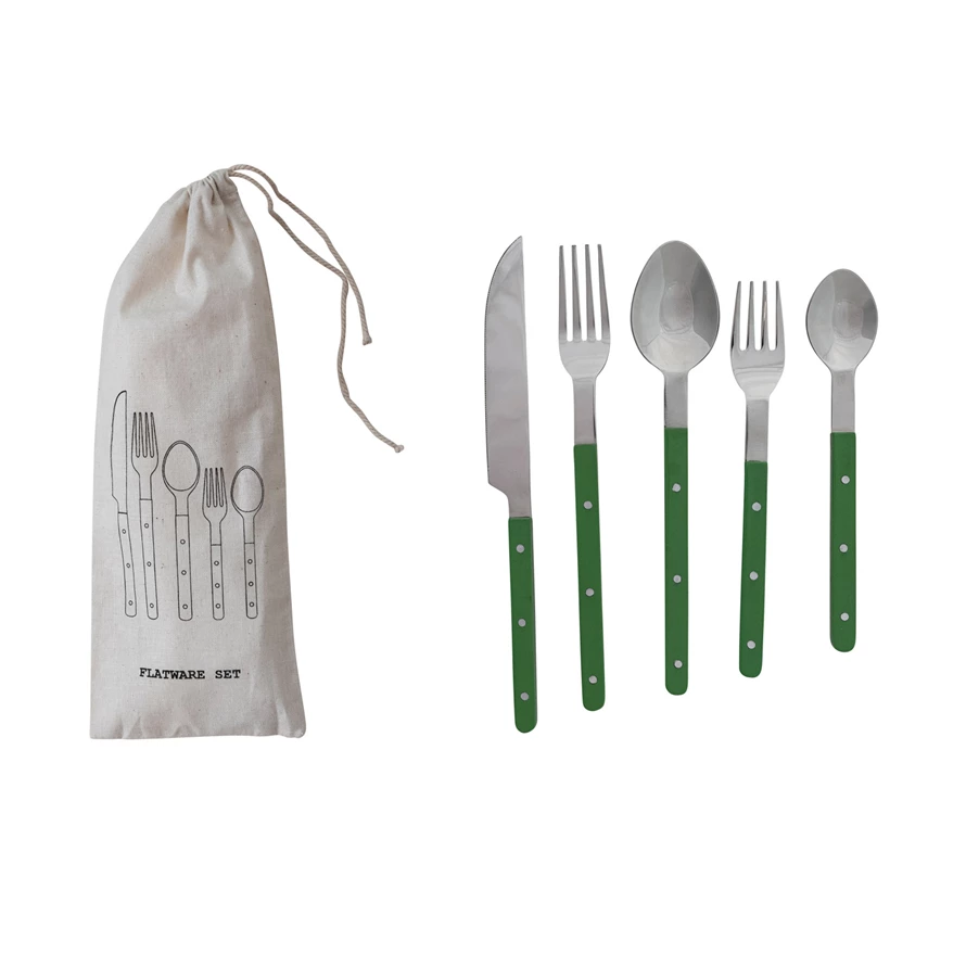 Stainless Steel Flatware Set with Resin Handles, Green, Set of 5 in Drawstring Bag