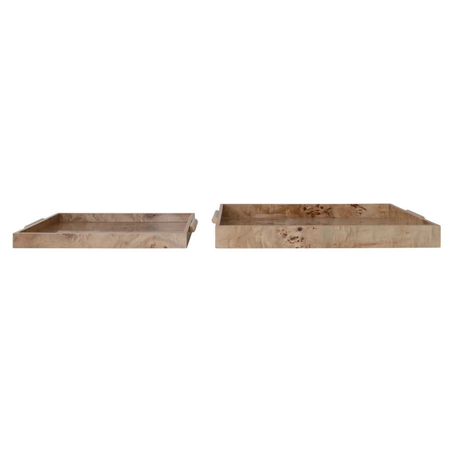 MDF & Burl Wood Veneer Trays with Handles, Natural, Set of 2