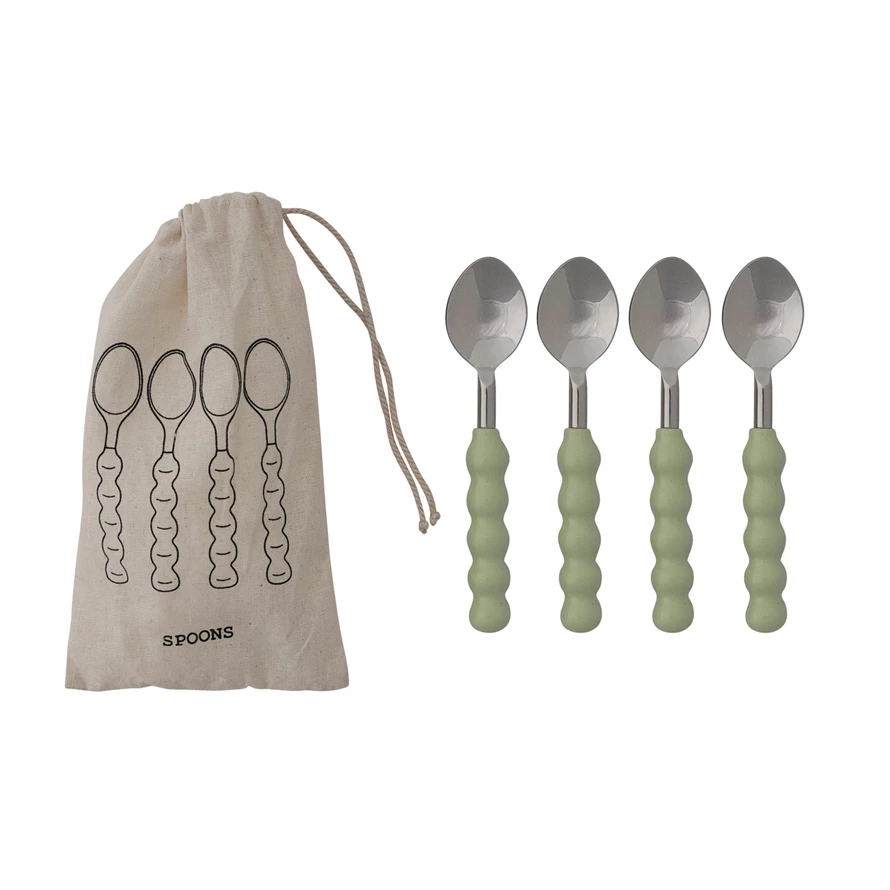Catalog Name: 5-1/2"L Stainless Steel & Aluminum Spoons w/ Enameled Ball Handles, Mint Color, Set of 4 in Printed Drawstring Bag
