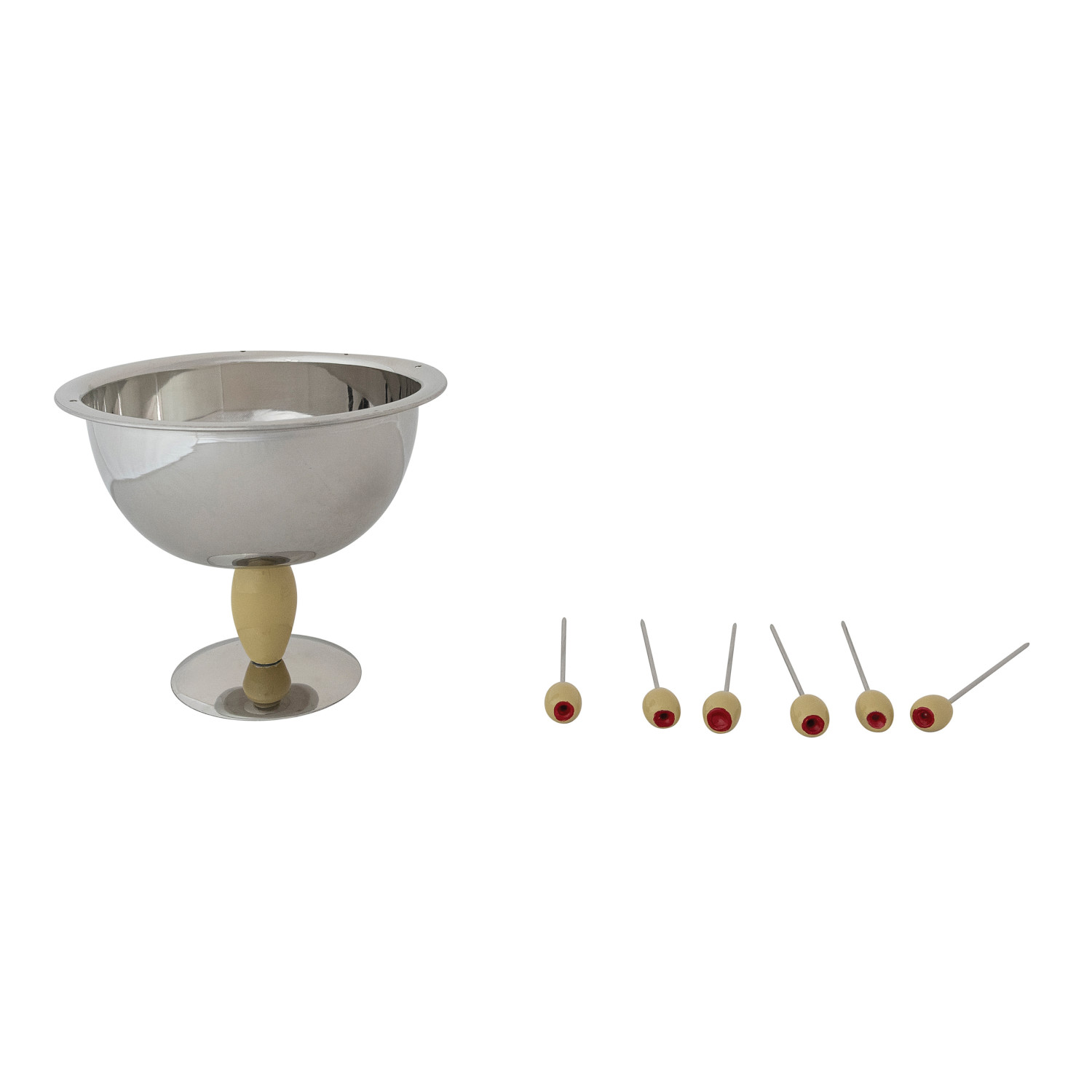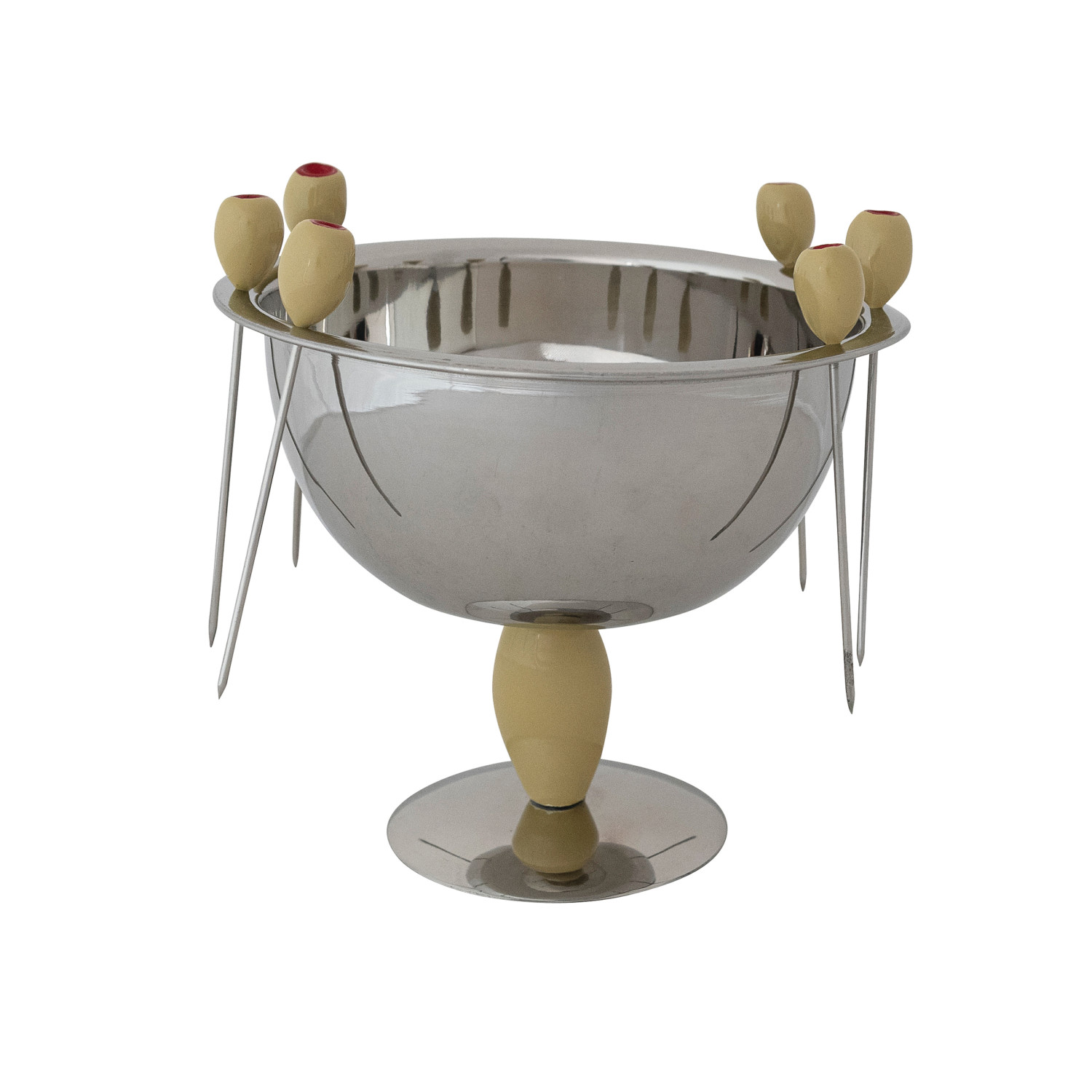 Enameled Stainless Steel Footed Bowl with (6) Olive Shaped Appetizer Picks on Rim, Set of 7