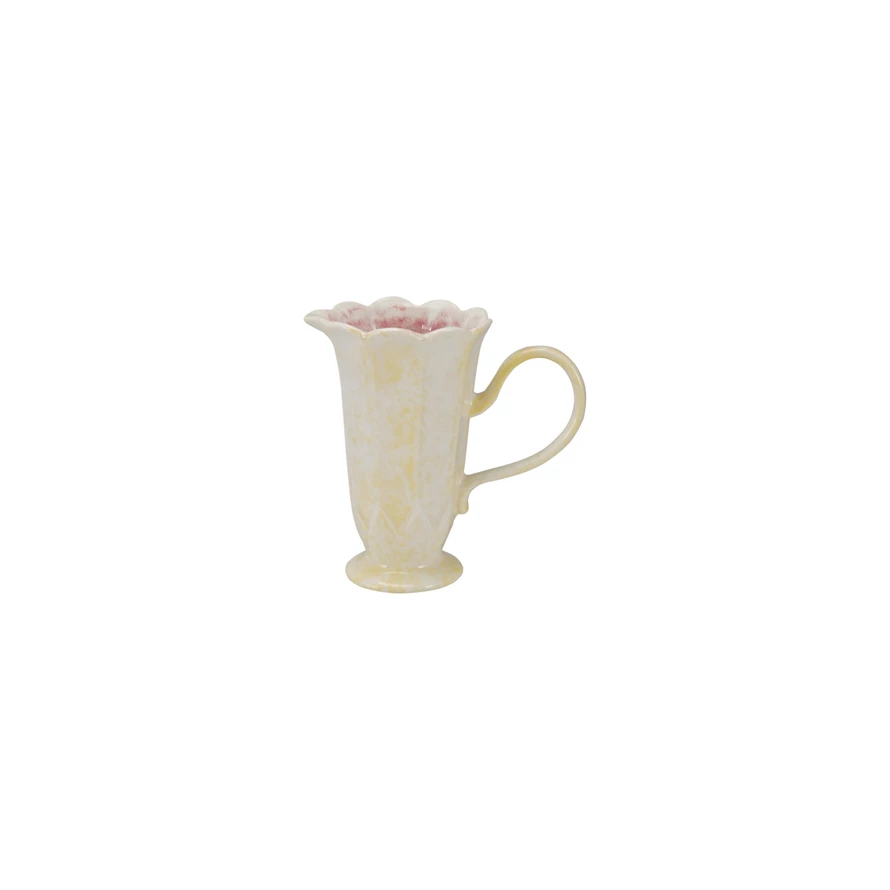 Catalog Name: 7"L x 4"W x 6-1/2"H 16 oz. Stoneware Flower Shaped Pitcher, Reactive Glaze, White, Pink & Yellow (Each One Will Vary)