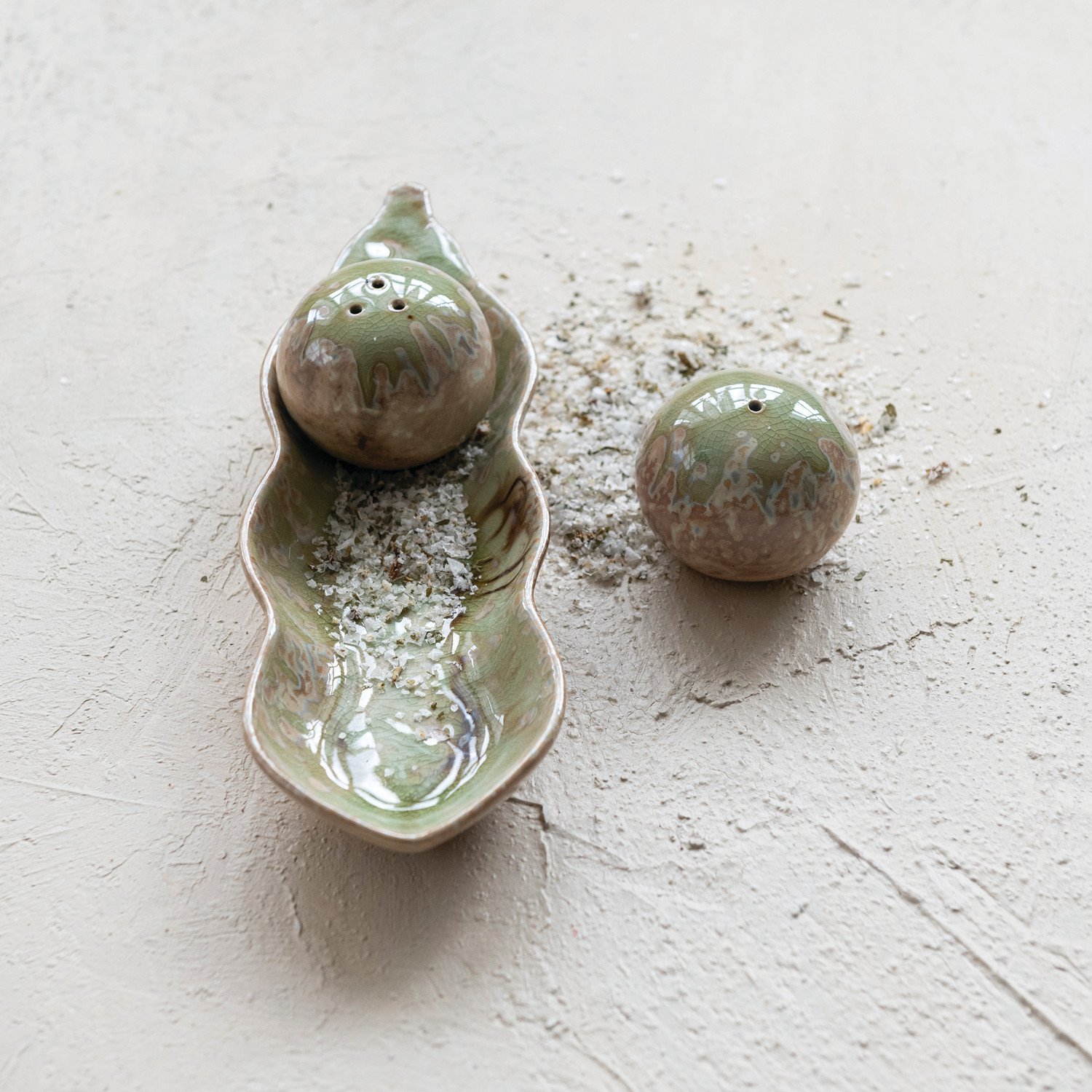 Catalog Name: 10-1/4"L x 2-1/4"W x 3"H Stoneware Peas in a Pod Shaped Salt & Pepper Shakers, Reactive Glaze, Green, Set of 3 (Each One Will Vary)