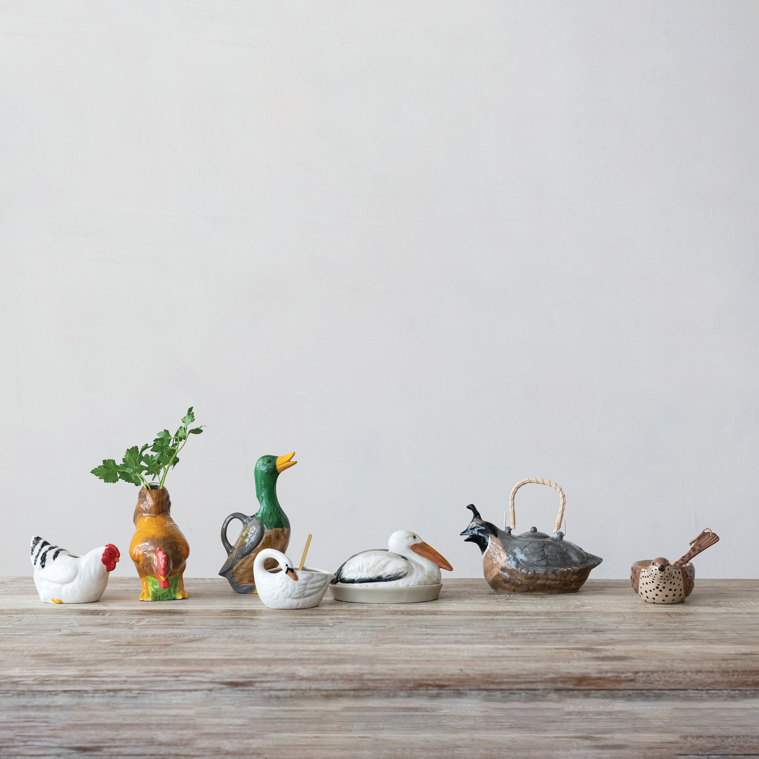 Hand-Painted Stoneware Bird Shaped Bowl & Tail Shaped Spoon with Jute Tie, Set of 2