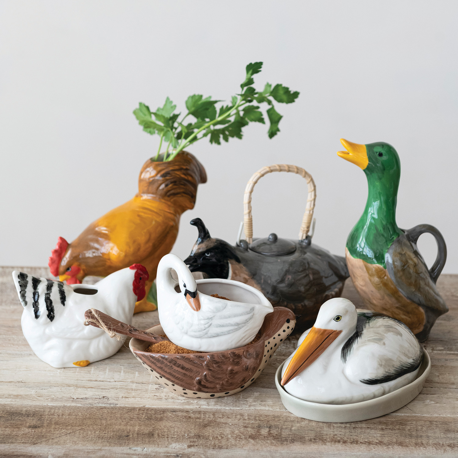 Catalog Name: 8-3/4"L x 4-1/2"W x 5-1/4"H 24 oz. Hand-Painted Stoneware Quail Shaped Teapot w/ Rattan Wrapped Handle, Multi Color
