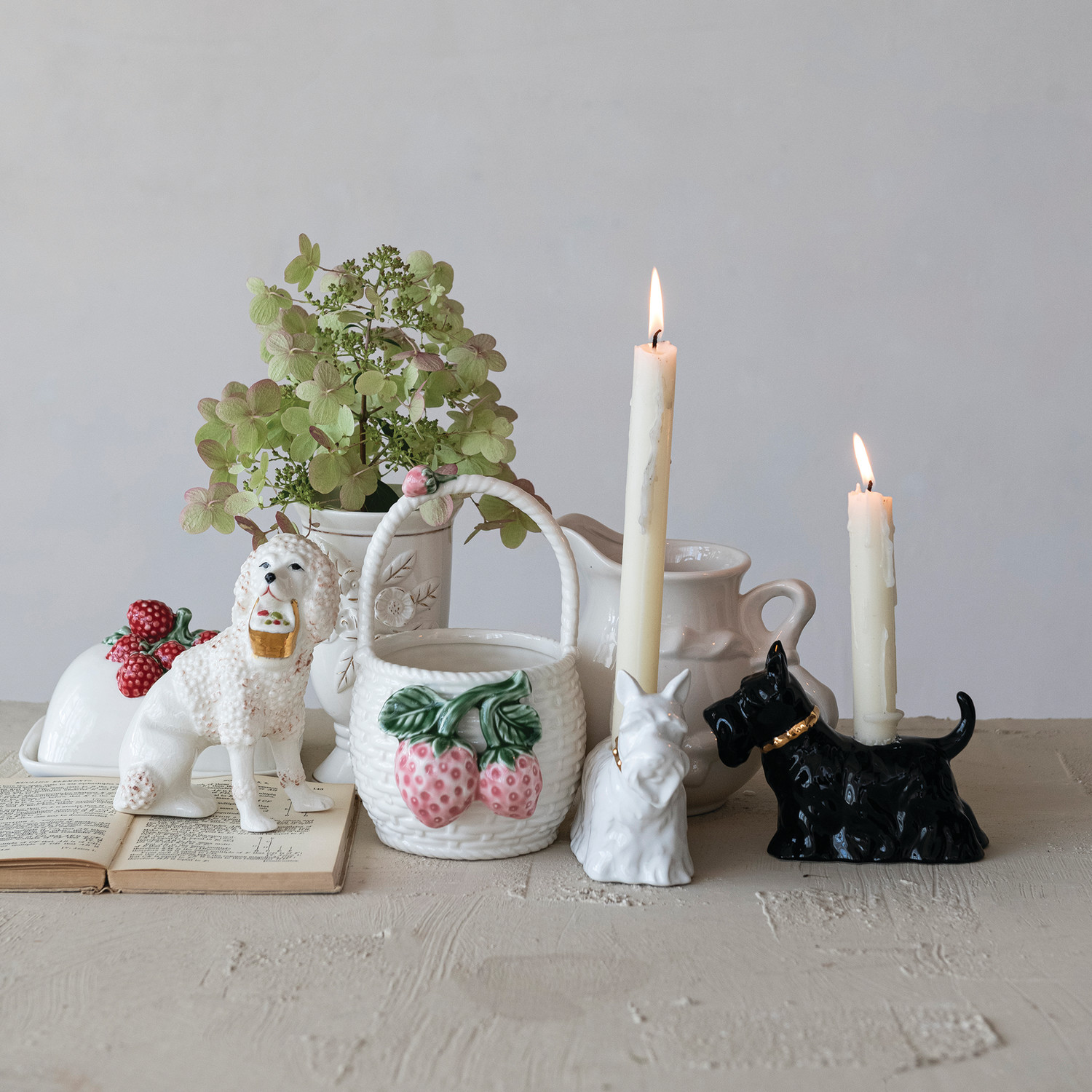 Catalog Name: 6"L x 5"W x 7-1/2"H Stoneware Basket Shaped Container w/ 3D Strawberries & Handle, White, Green & Pink