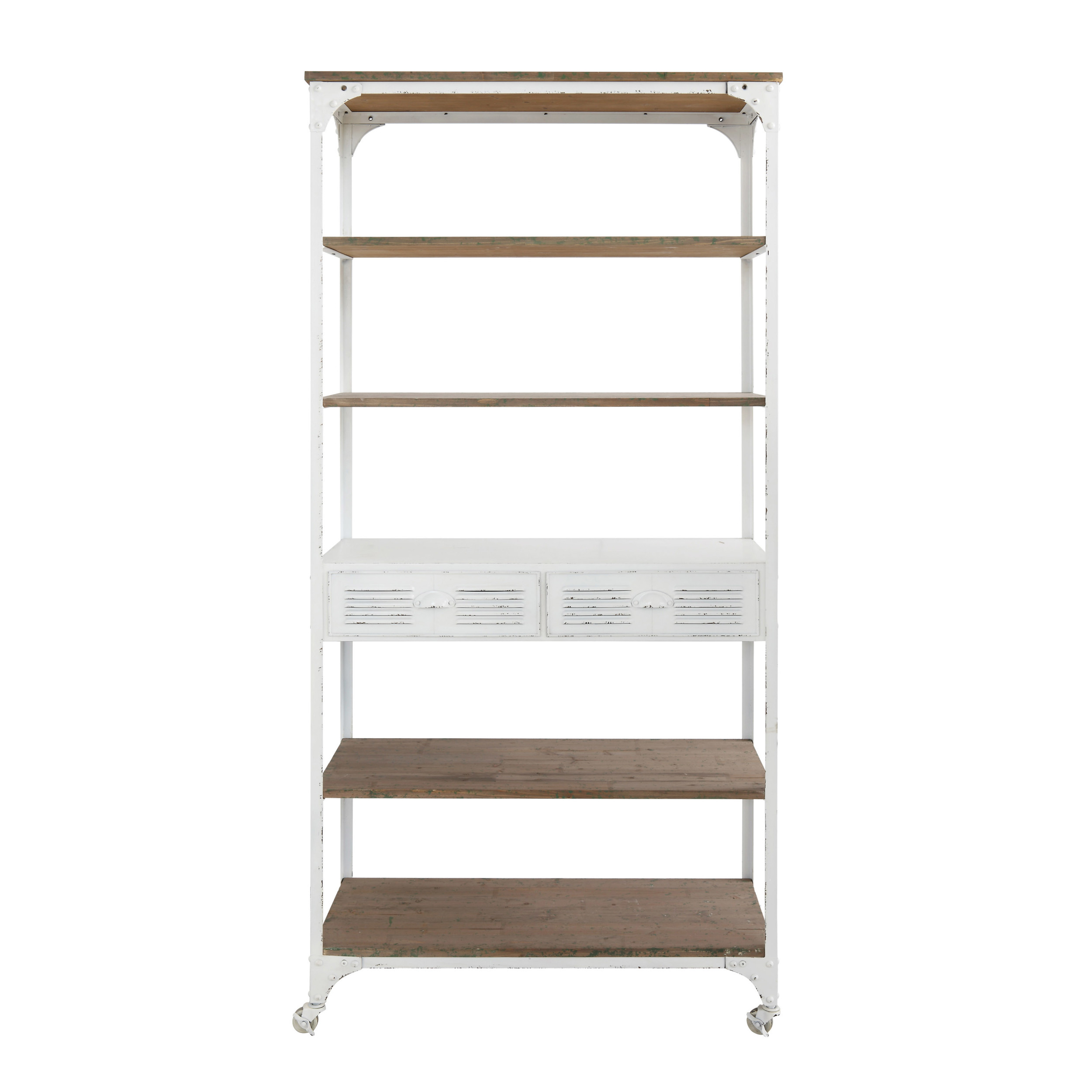 There are 5 shelves and 2 drawers in this amazing piece. The combination of metal and wood give it a special country charm.. The best part is that it is on casters and easily movable.
