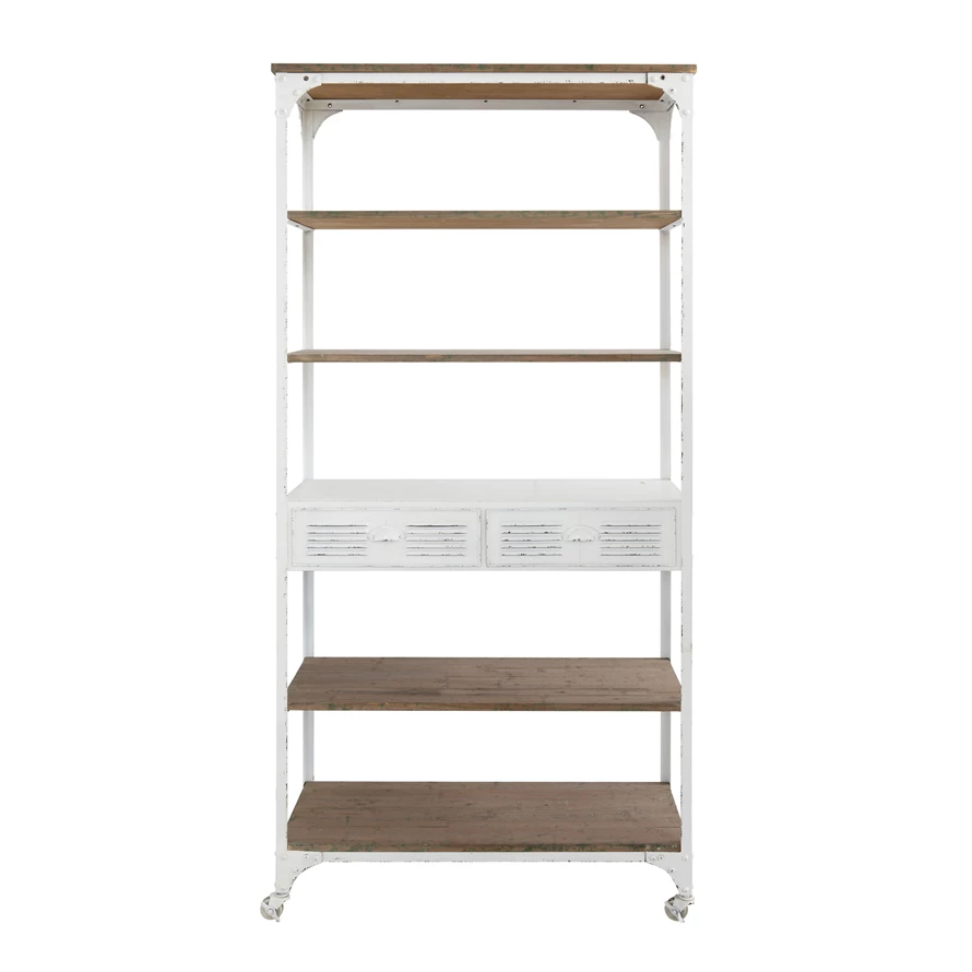 Catalog Name: 36-1/2"W x 16-1/2"D x 78"H Metal & Wood 5-Tier Shelf on Casters w/ 2 Drawers, Distressed White & Natural, KD, Truck Ship