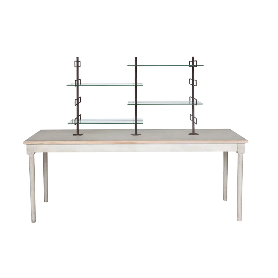 Catalog Name: 83-3/4"L x 31-1/2"W x 63-3/4"H Wood & MDF Vintage Reproduction Table w/ 4 Metal & Glass Shelves, Whitewashed, KD, Truck Ship