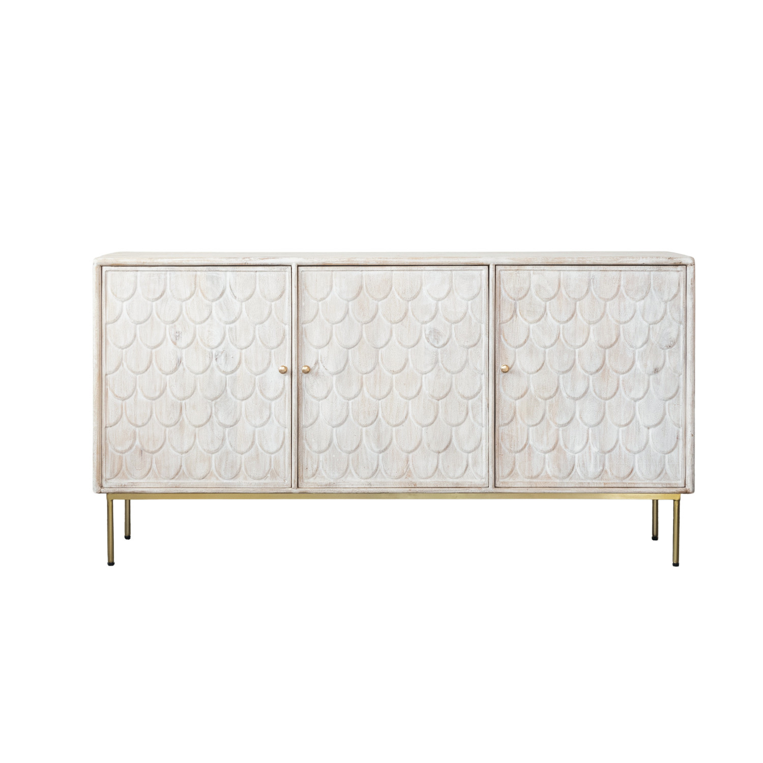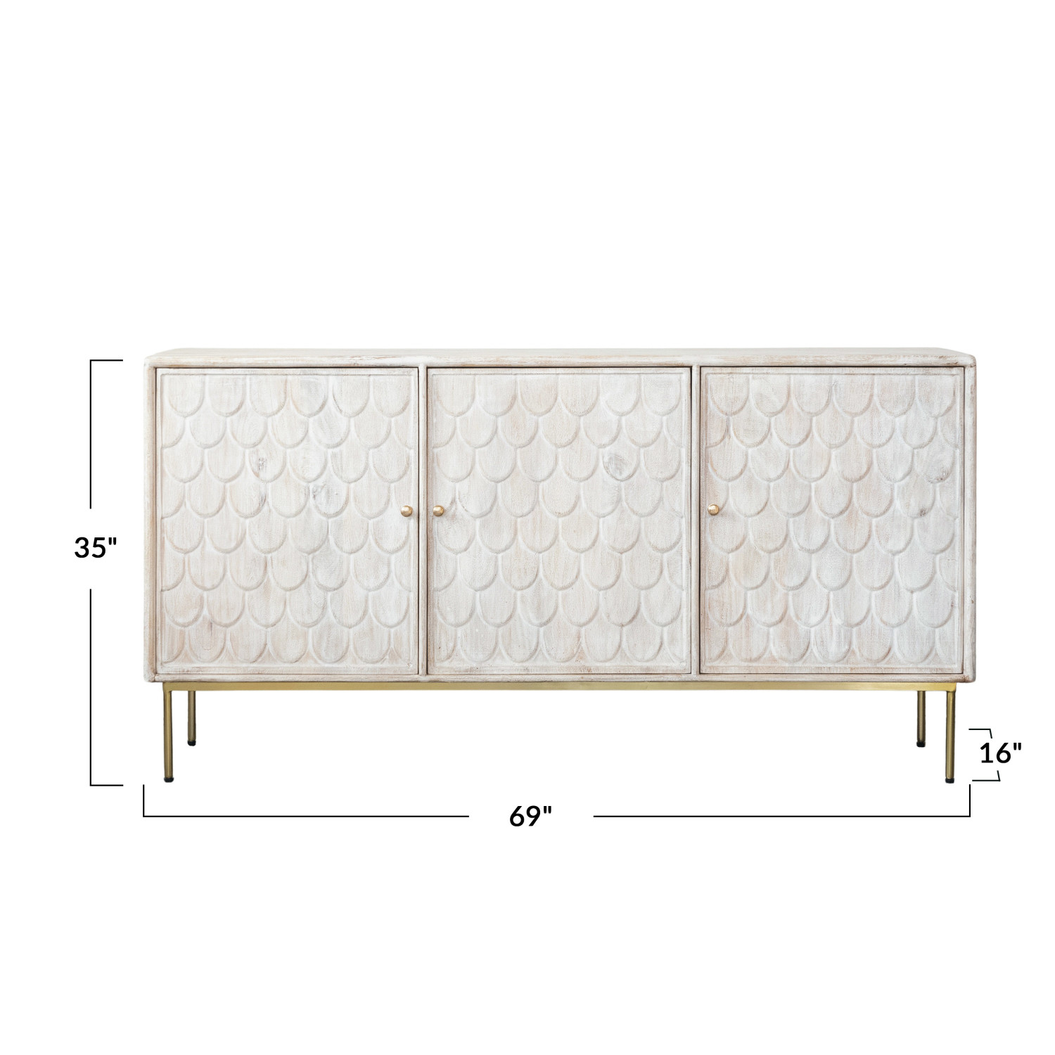 Catalog Name: 69"W x 16"D x 35"H MDF & Carved Mango Wood Console w/ 3 Soft Close Doors, 3 Removable Shelves, Antique Brass Finish Metal Legs & Knobs, Bleached, Truck Ship