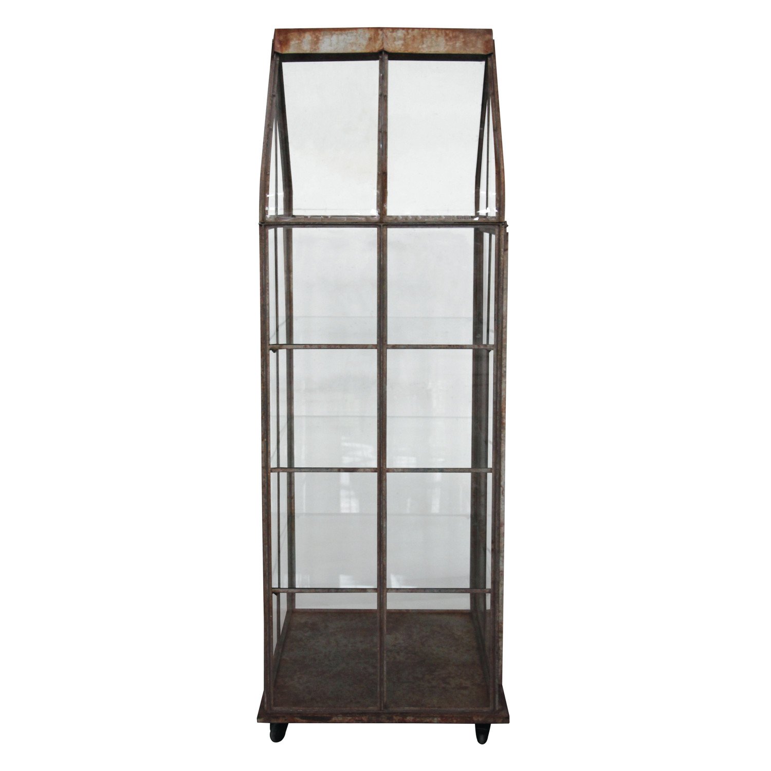 This Metal and Acrylic Terrarium, standing tall on caster wheels, is a beautifully distressed piece that brings a touch of vintage charm to any setting. Its three glass shelves offer a combined weight capacity of 51 pounds, perfect for an array of potted greens or decorative items. The terrarium's generous size, 32.25 inches long by 24.25 inches wide by 70 inches high, makes it a versatile addition to the home. Whether placed in a sunlit corner or as a centerpiece, this terrarium on wheels is a delightful blend of form and function, ready to roll into heart and home. Each piece varies, adding to its unique character.