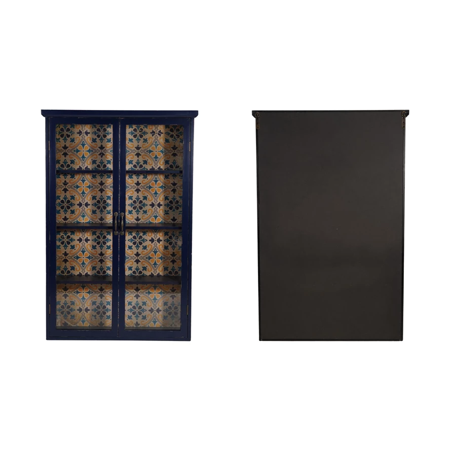 Catalog Name: 31-3/4"W x 8-1/2"D x 48"H Wood, MDF & Glass Cabinet w/ 4 Shelves & Patterned Paper Back, Distressed Blue, Yellow & White, Truck Ship (Hangs or Sits)
