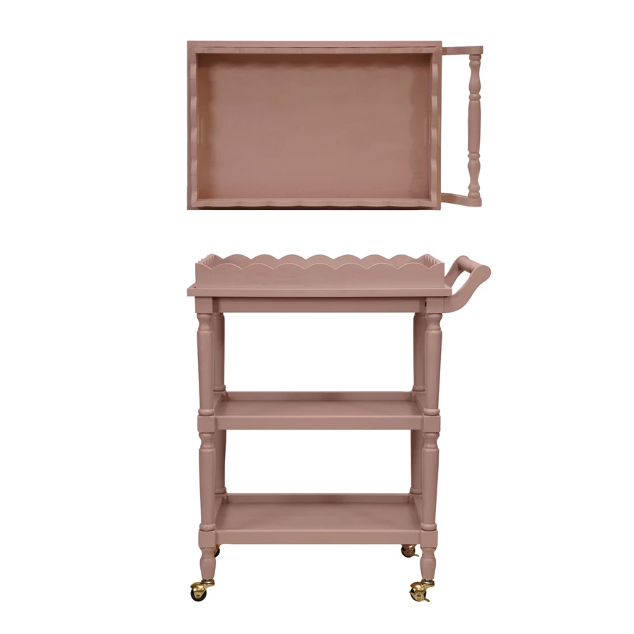 Catalog Name: 27-1/4"W x 15-3/4"D x 31-3/4"H MDF & Wood 3-Tier Bar Cart on Casters w/ Removable Scalloped Tray, Pink & Gold Finish, Set of 2, KD