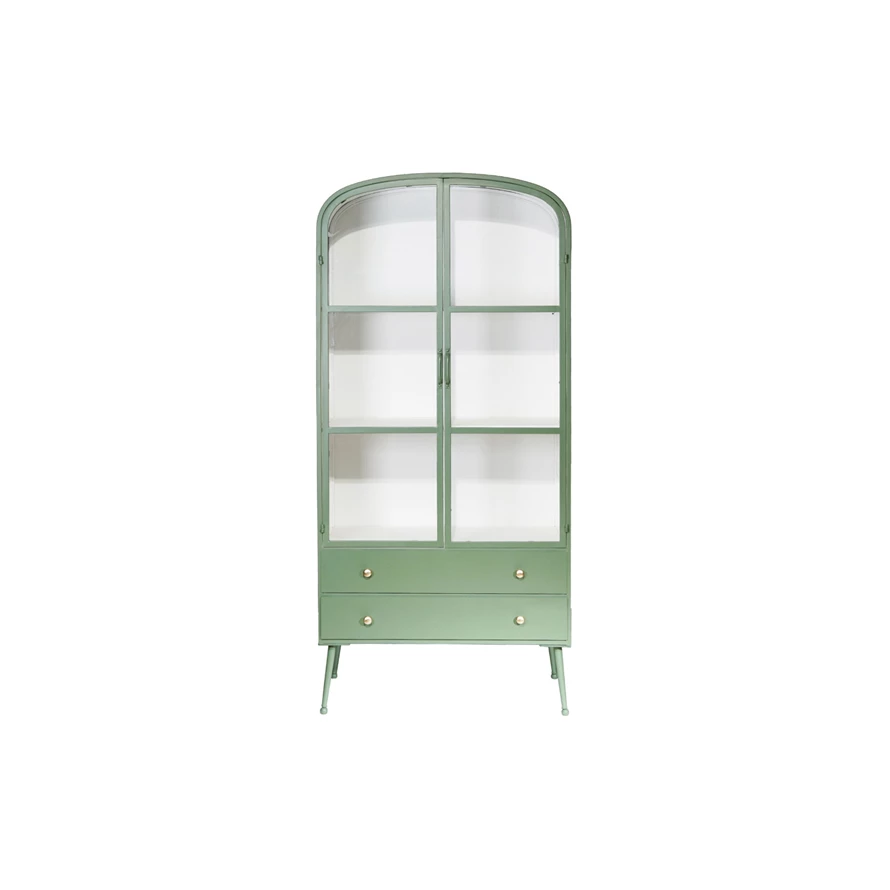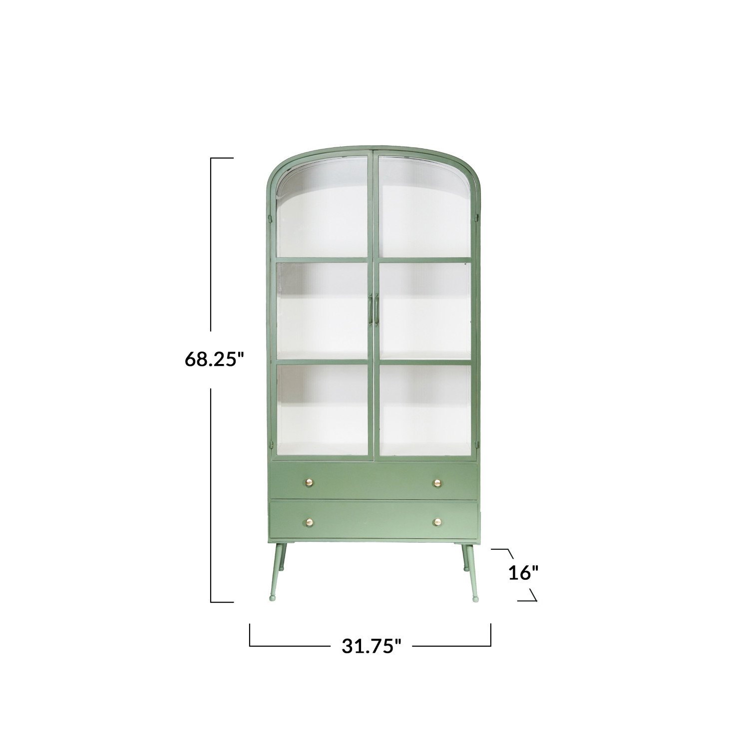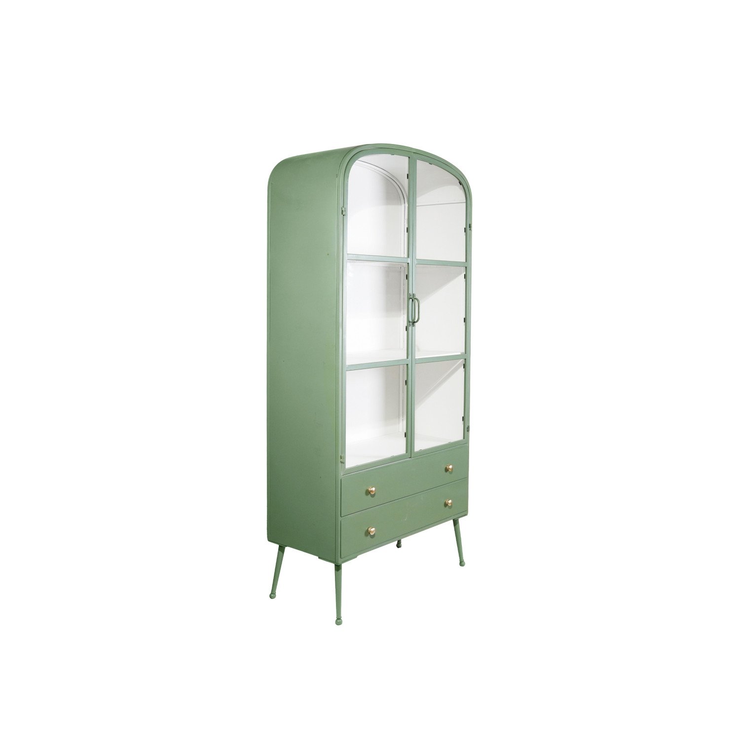 Metal Cabinet w/ 3 Shelves, 2 Glass Doors, 2 Drawers & Gold Knobs, Green & White