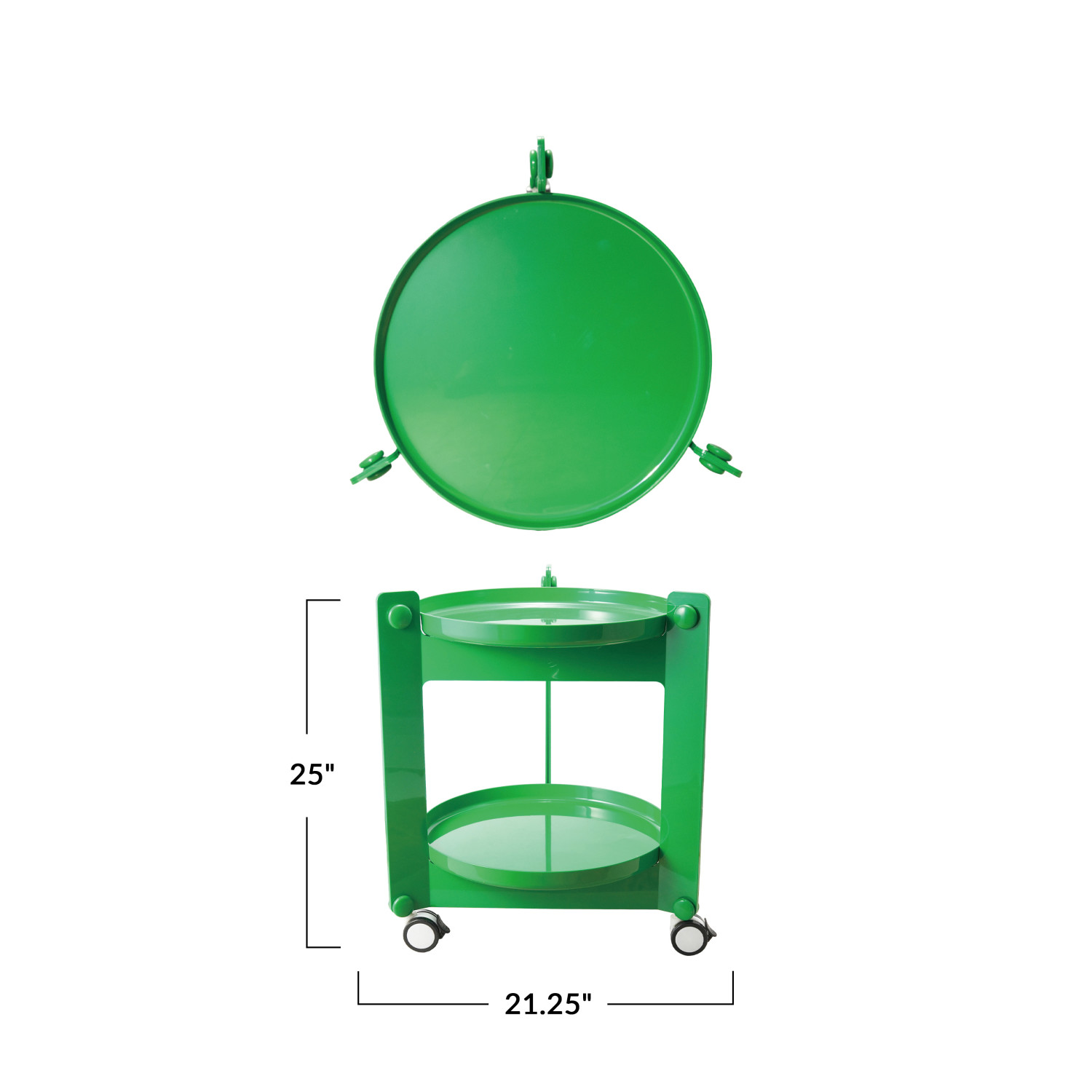 Catalog Name: 21-1/4" Round x 25"H Plastic 2-Tier Bar Cart on Casters w/ Removable Trays, Green, KD