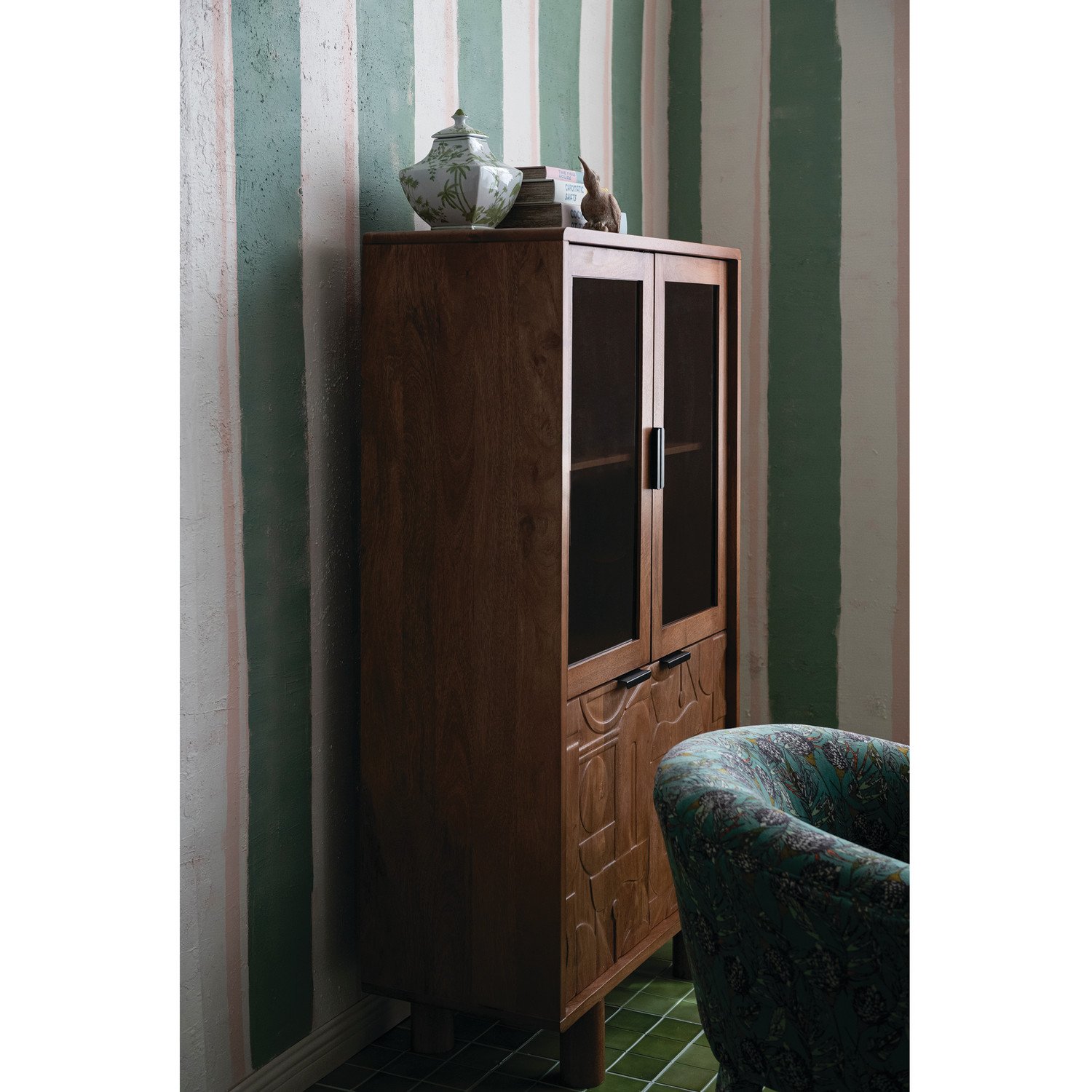 Carved Wood Cabinet with 2 Glass Top Doors, 2 Bottom Doors & 4 Shelves, KD