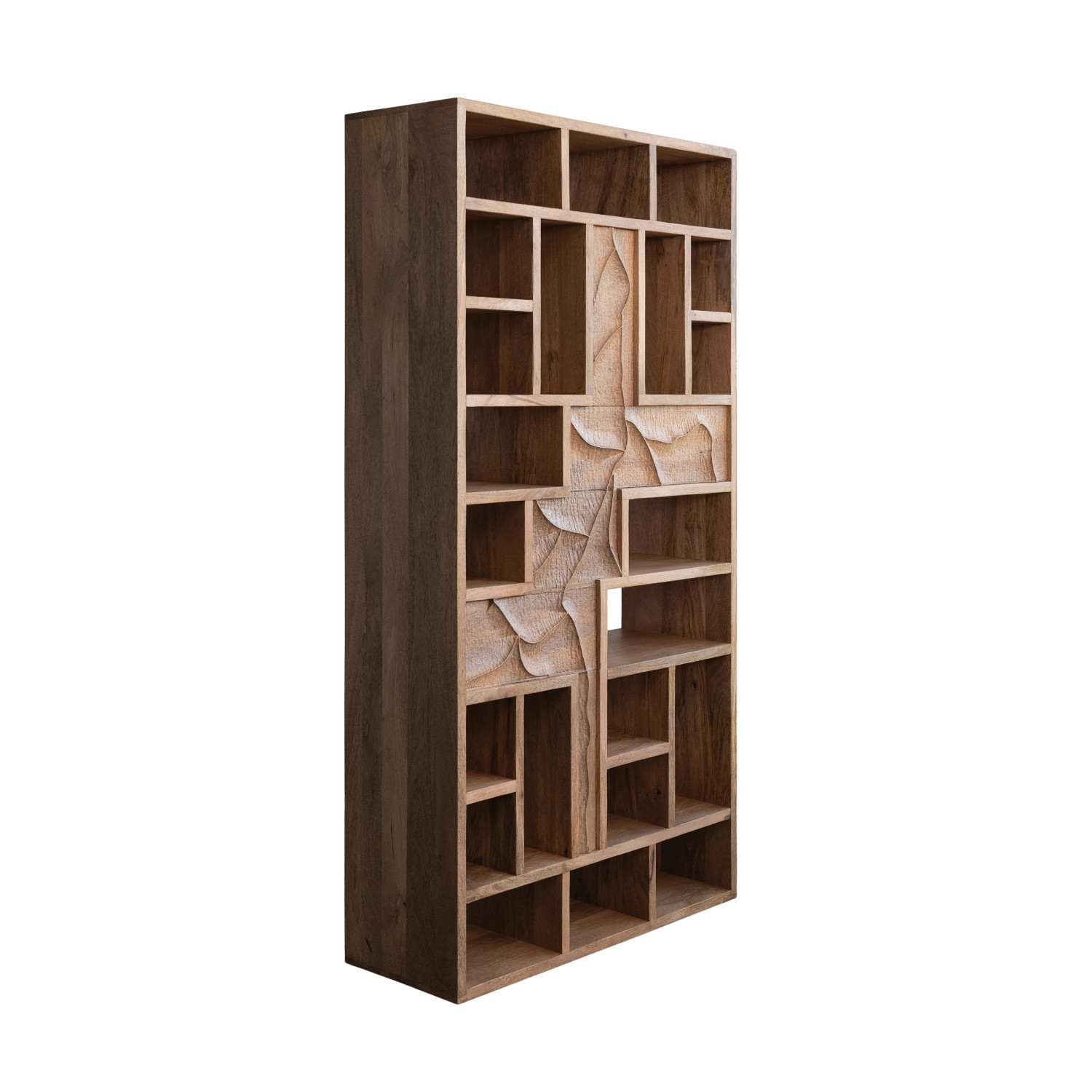 Catalog Name: 39"W x 14"D x 74"H Carved Mango Wood Two-Sided Shelf w/ 22 Compartments, Natural, Truck Ship (Sits Vertically or Horizontally)