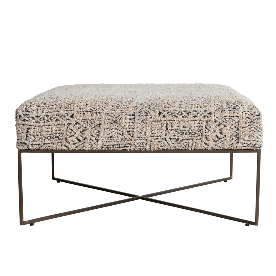 Catalog Name: 34" Square x 18"H Metal & Woven Damask Upholstered Ottoman, Antique Brass Finish, Cream Color & Black, Truck Ship