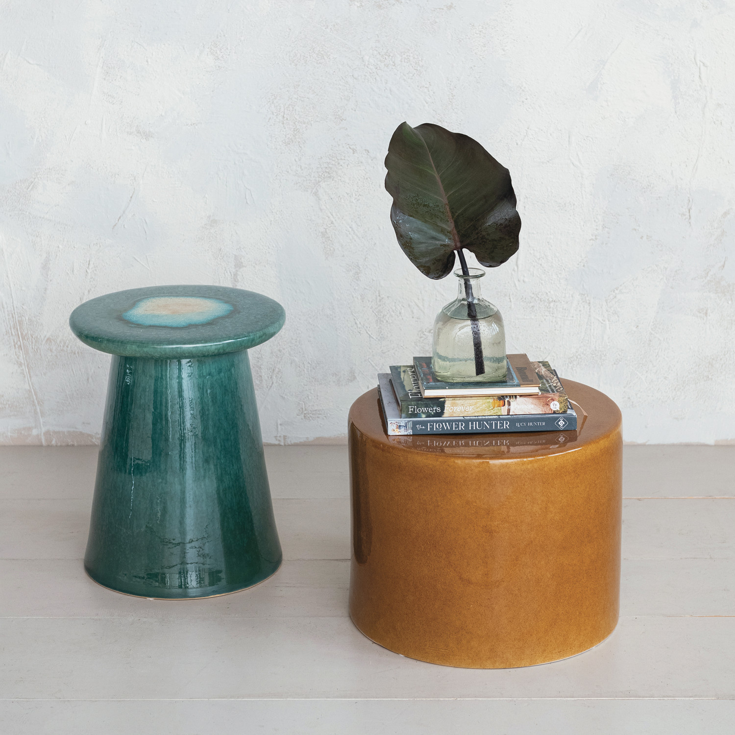 Catalog Name: 16-1/2" Round x 13-1/4"H Stoneware Table/Stool, Reactive Glaze, Mustard Color, Truck Ship (Each One Will Vary)