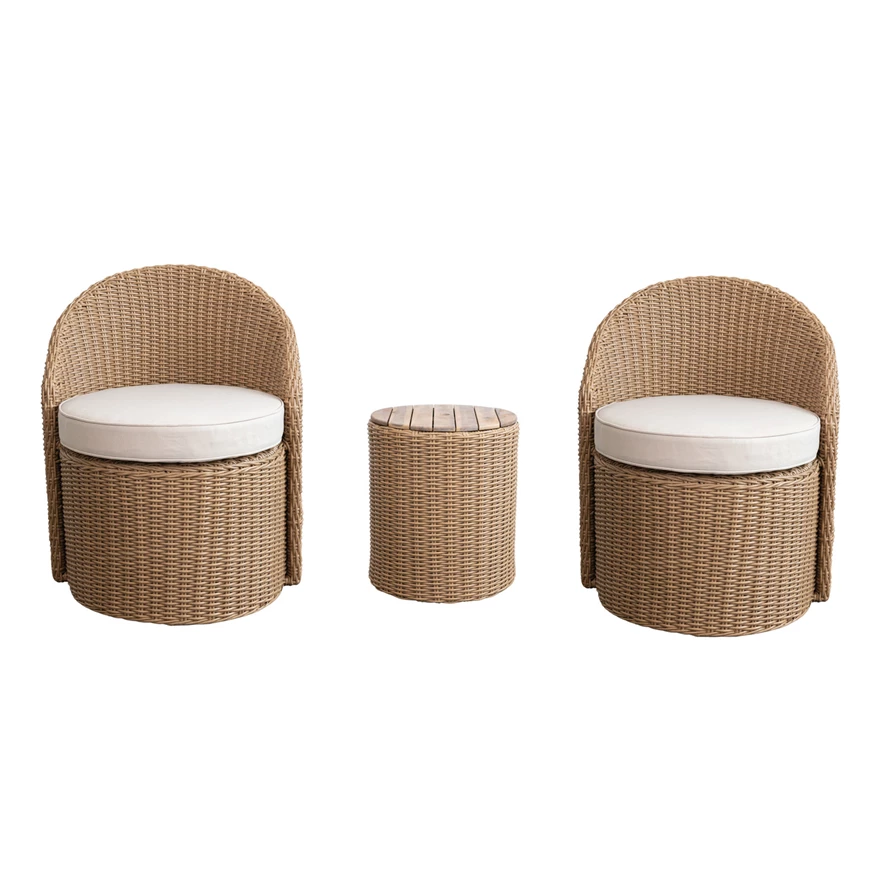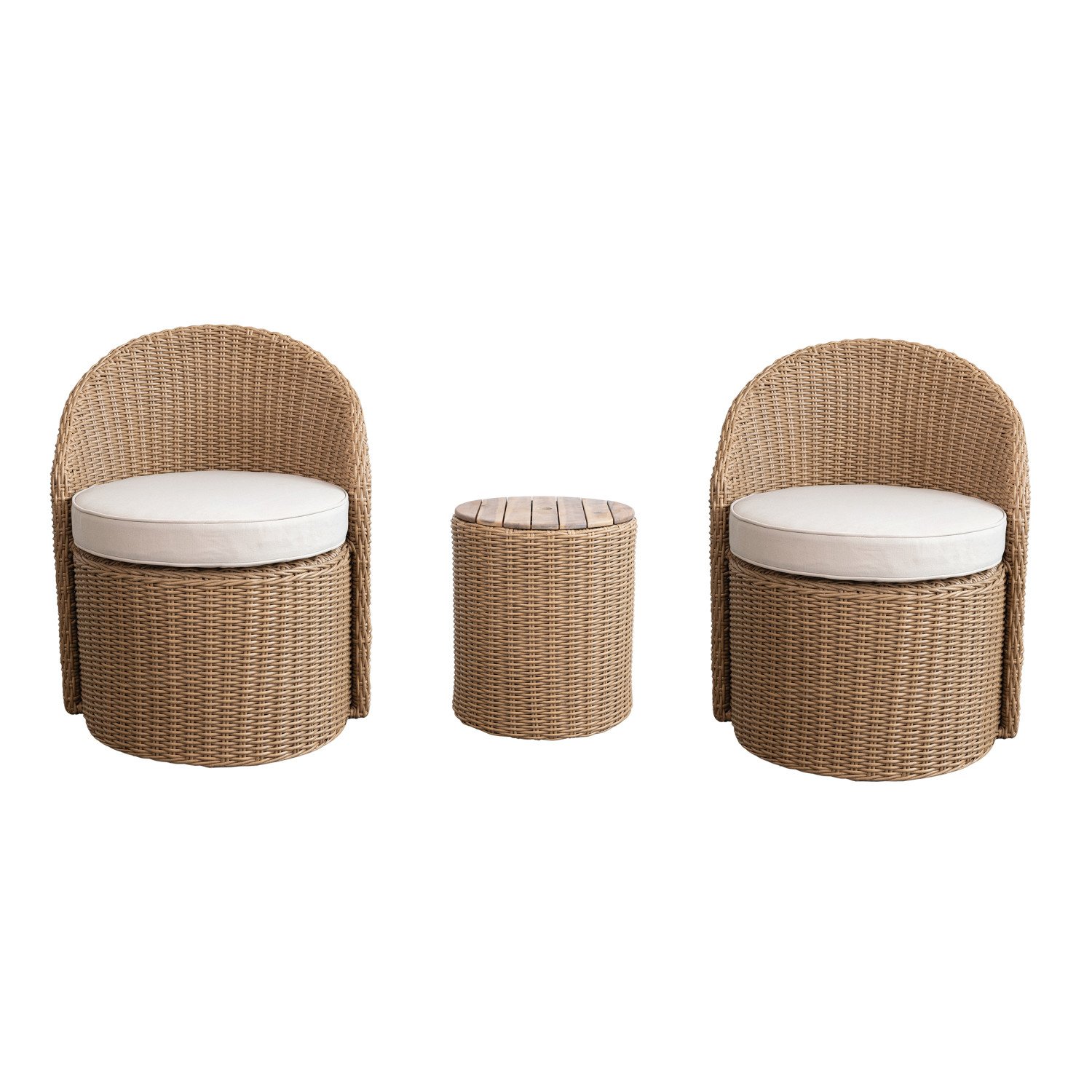 Catalog Name: (2) 25-3/4"W x 24"D x 32"H Plastic Wicker Indoor/Outdoor Swivel Chairs w/ Fabric Cushions & 15-3/4" Round x 18-1/2"H Storage Table w/ Acacia Wood Lid, Natural & Ivory Color, Set of 3, Truck Ship
