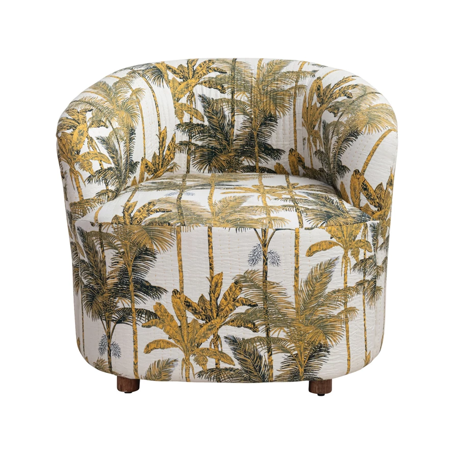 Catalog Name: 32-1/2"W x 32-1/4"D x 27-1/2"H Cotton Voile Upholstered Printed Chair w/ Palm Trees Pattern, Hand-Embroidered Kantha Stitch, Mango Wood Legs & Nail Heads, Walnut Finish, Multi Color, Truck Ship (Each One Will Vary)