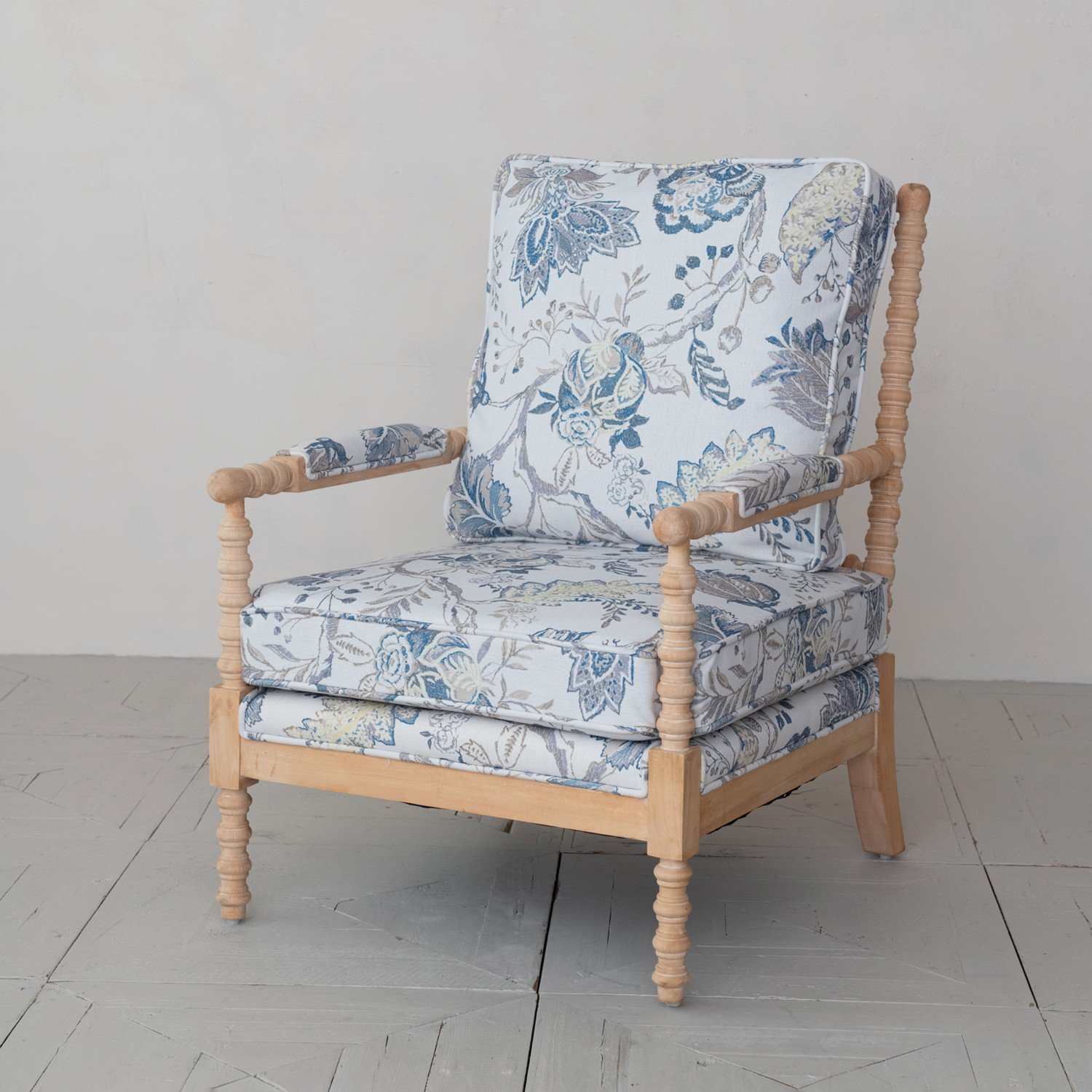 Linen Fabric Upholstered Chair w/ Floral & Leaf Pattern & Spindle Wood Frame