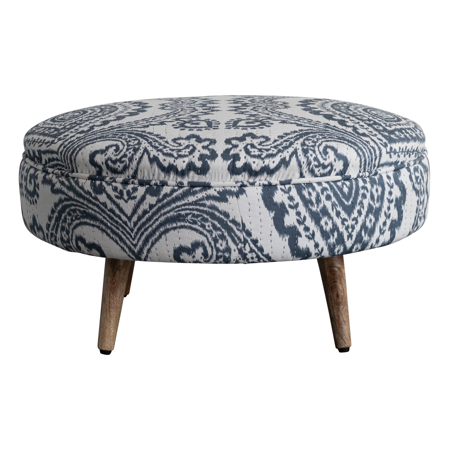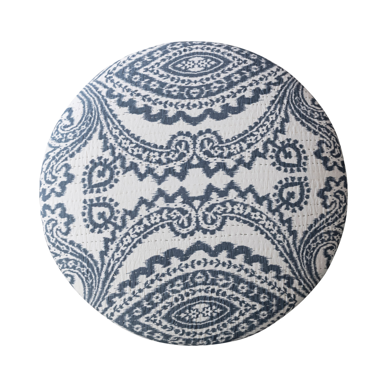 Catalog Name: 30" Round x 16"H Cotton Voile Upholstered Stool w/ Paisley Pattern, Hand-Embroidered Kantha Stitch & Mango Wood Legs, Blue, Cream Color & Natural