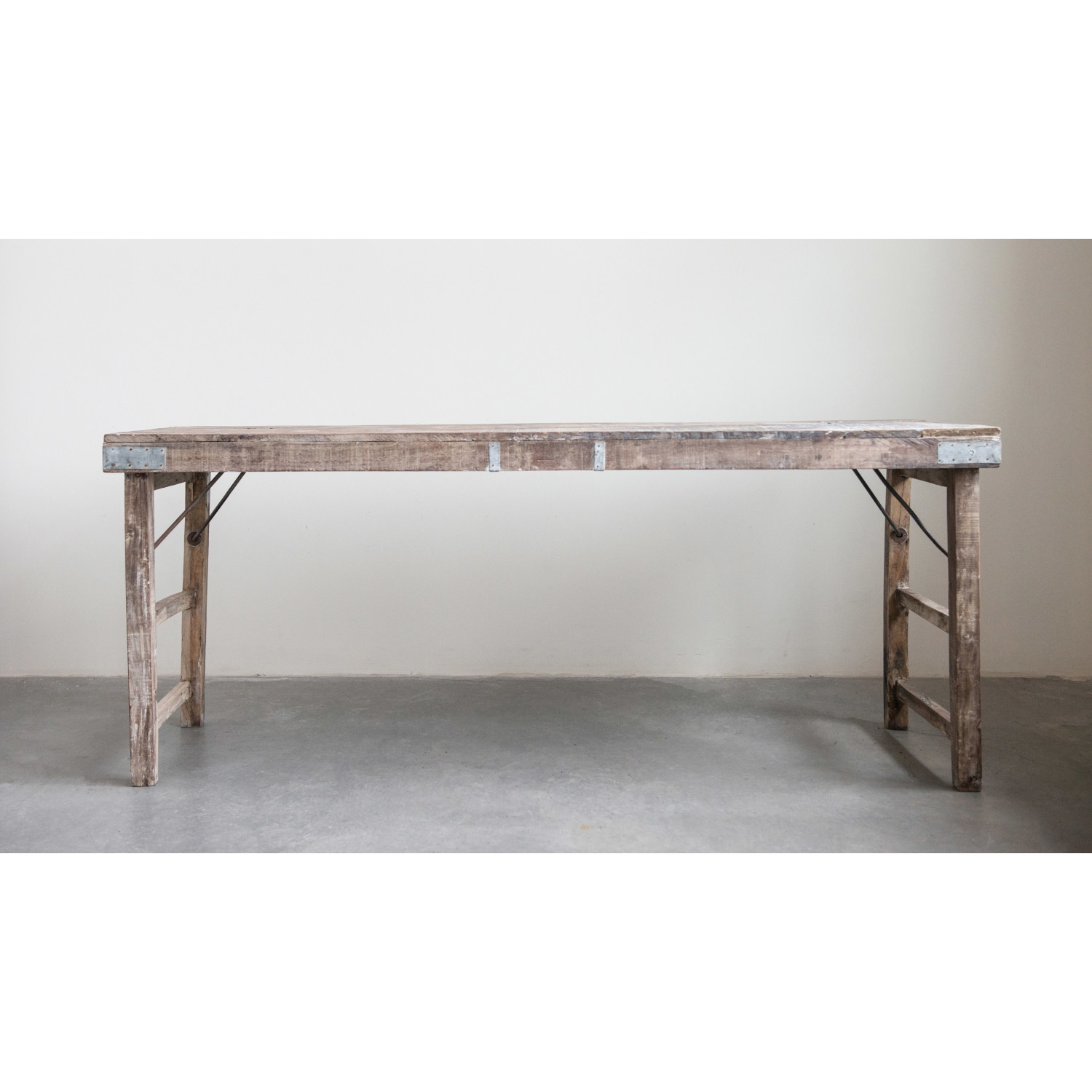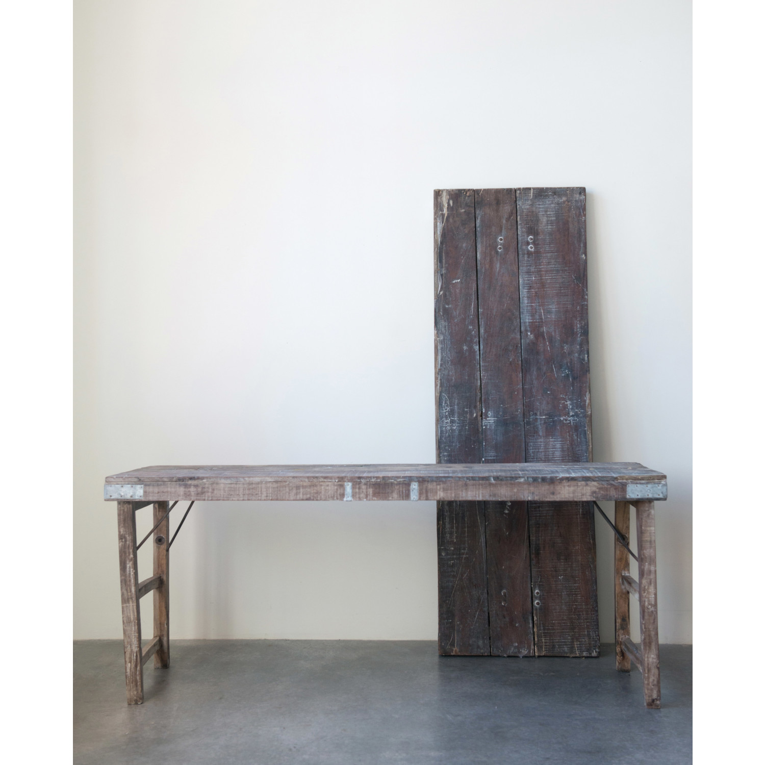 Catalog Name: 68"W x 22"D x 31"H Reclaimed Wood Folding Table w/ Tin Patches, Truck Ship (Each One Will Vary)