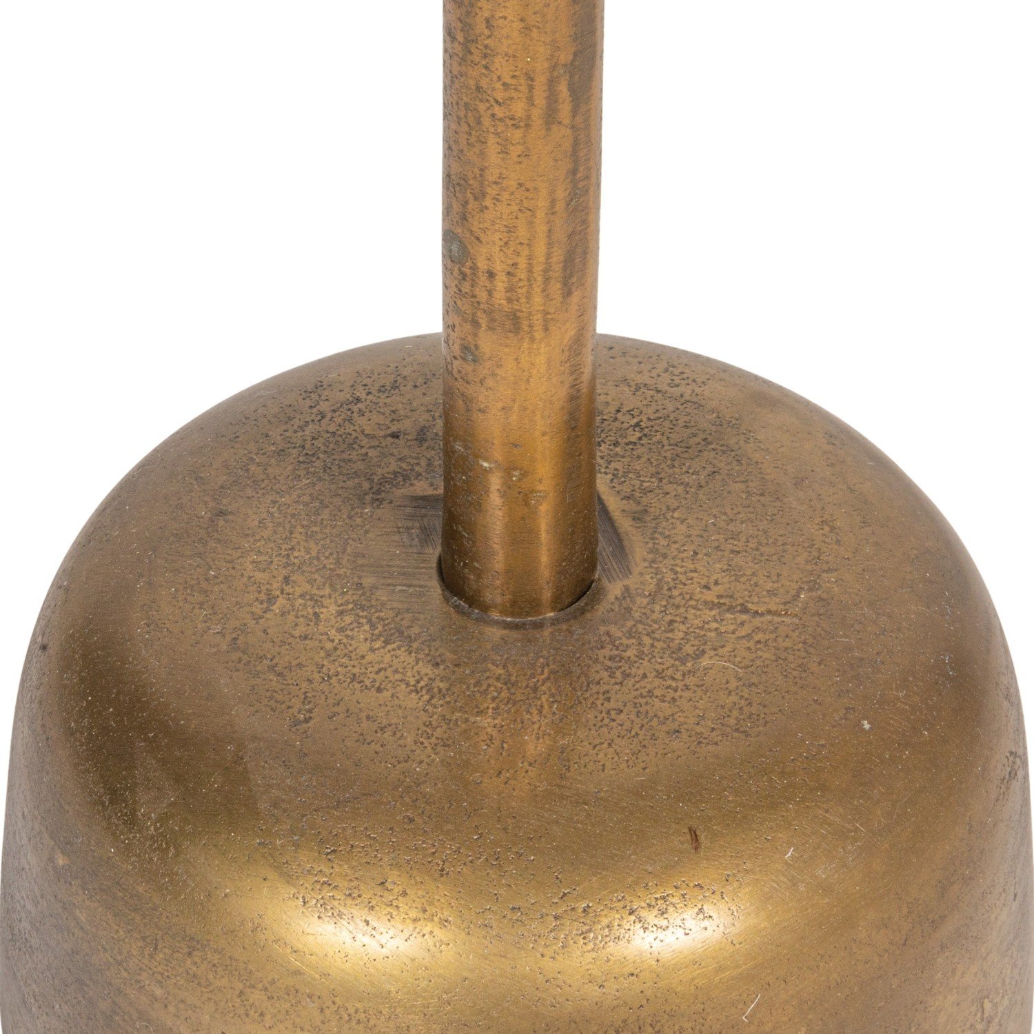 This sleek and elegant side table features a pure aluminum top with a thin stem and an antique brass finish. It is made of lightweight and durable metal that has a smooth and polished surface. The antique brass finish adds shine and sophistication to the table. The table has a round top that can display or store items, such as lamps, vases, candles, or books. The table also has a thin stem that supports the top and creates a minimalist and modern look. The stem has a simple and sturdy design, with a round base that provides stability and support. The table measures 12 inches in diameter and 20 inches in height, with a weight capacity of 44 pounds. The table's size and shape make it suitable for any space, such as living room, bedroom, or entryway. This aluminum side table with a thin stem and antique brass finish adds shine and sophistication to any room. A sleek and elegant side table that features a round aluminum top with a thin stem and an antique brass finish. Perfect for vintage, eclectic, and contemporary home décor styles, adding a touch of elegance to any space. Ideal for adding some shine and sophistication to any room. Made of pure aluminum, a lightweight and durable metal that has a smooth and polished surface.