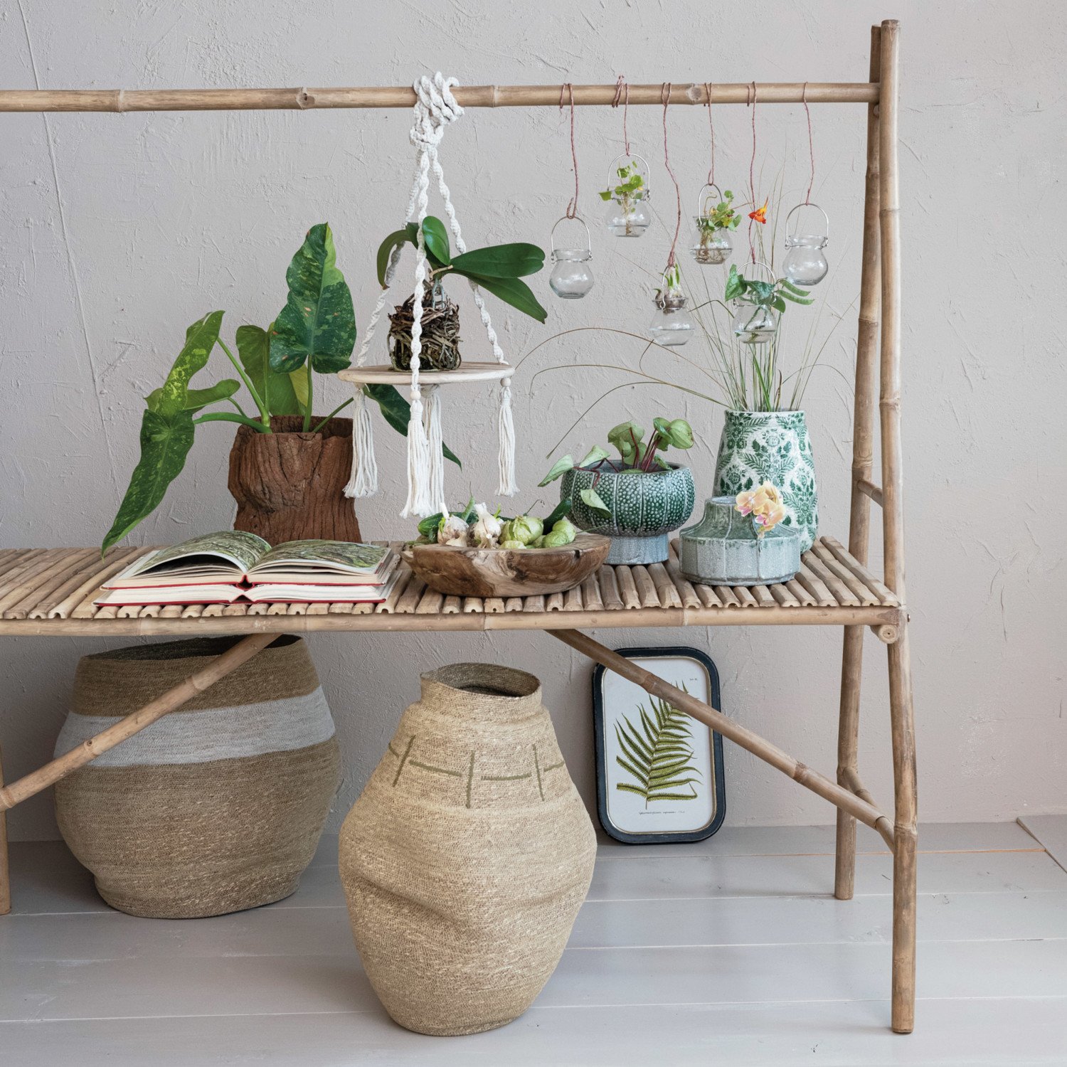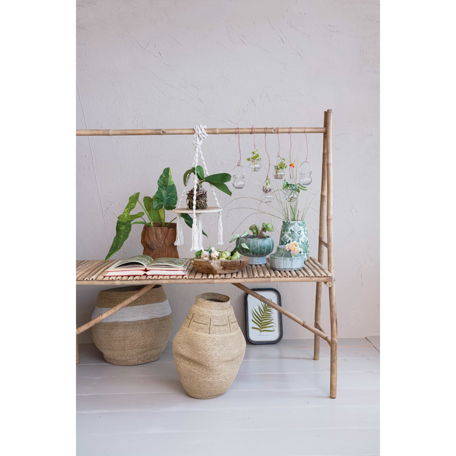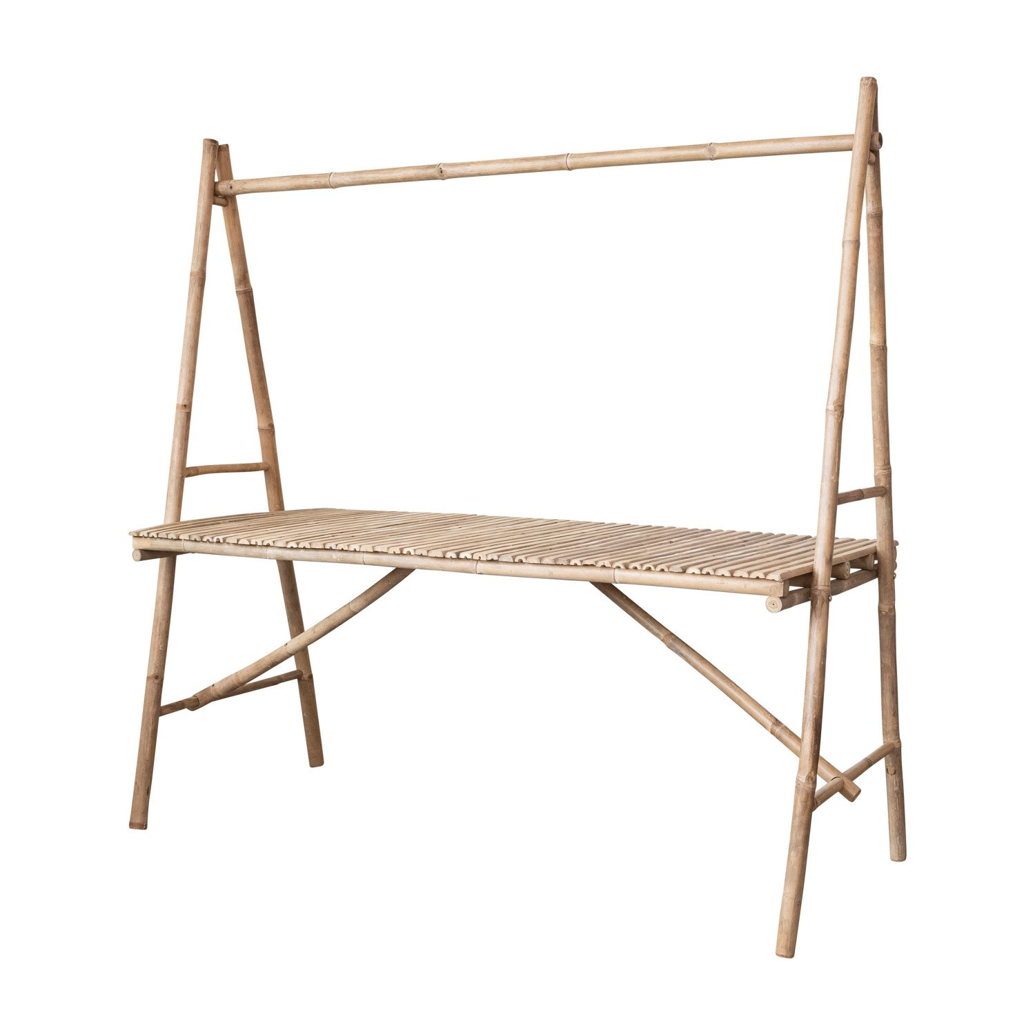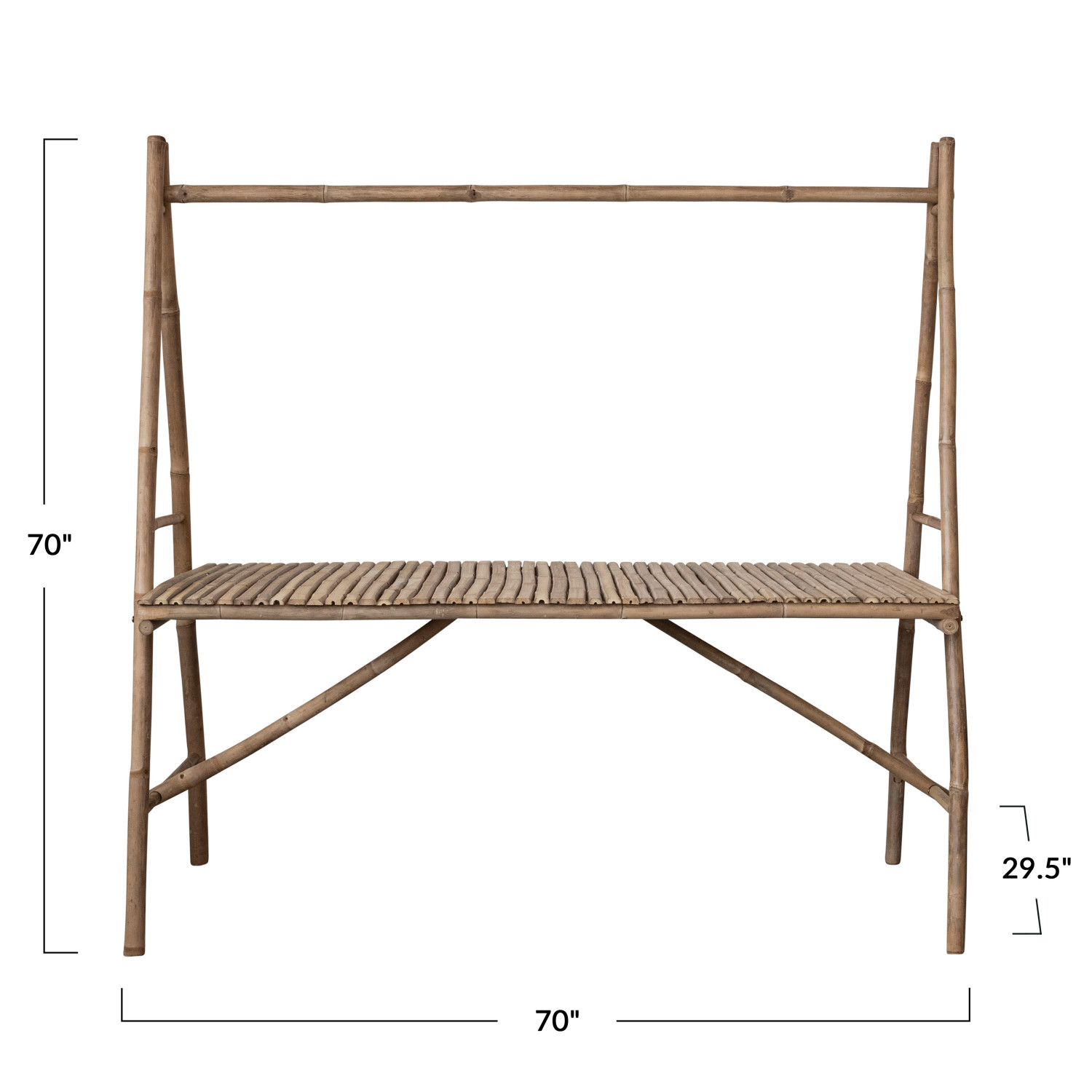 This handmade bamboo table with a rod is a stylish and versatile piece of furniture that will enhance any room. It is made of high-quality bamboo that has been handcrafted into a sturdy and elegant frame. The table has a natural finish that showcases the beauty and texture of the bamboo. The table has a rectangular shape with a large tabletop that offers ample space for dining, working, or entertaining. The table also has a rod that extends from one side of the table, to hang clothes or other items that need extra space. The rod has hooks on both ends that make it easy to attach or detach. The table measures 70 inches in length, 29.5 inches in width, and 70 inches in height, making it a perfect size for any space. This handmade bamboo table with a rod is a great choice for adding farmhouse, French country, coastal, Scandinavian, or boho style to the home.