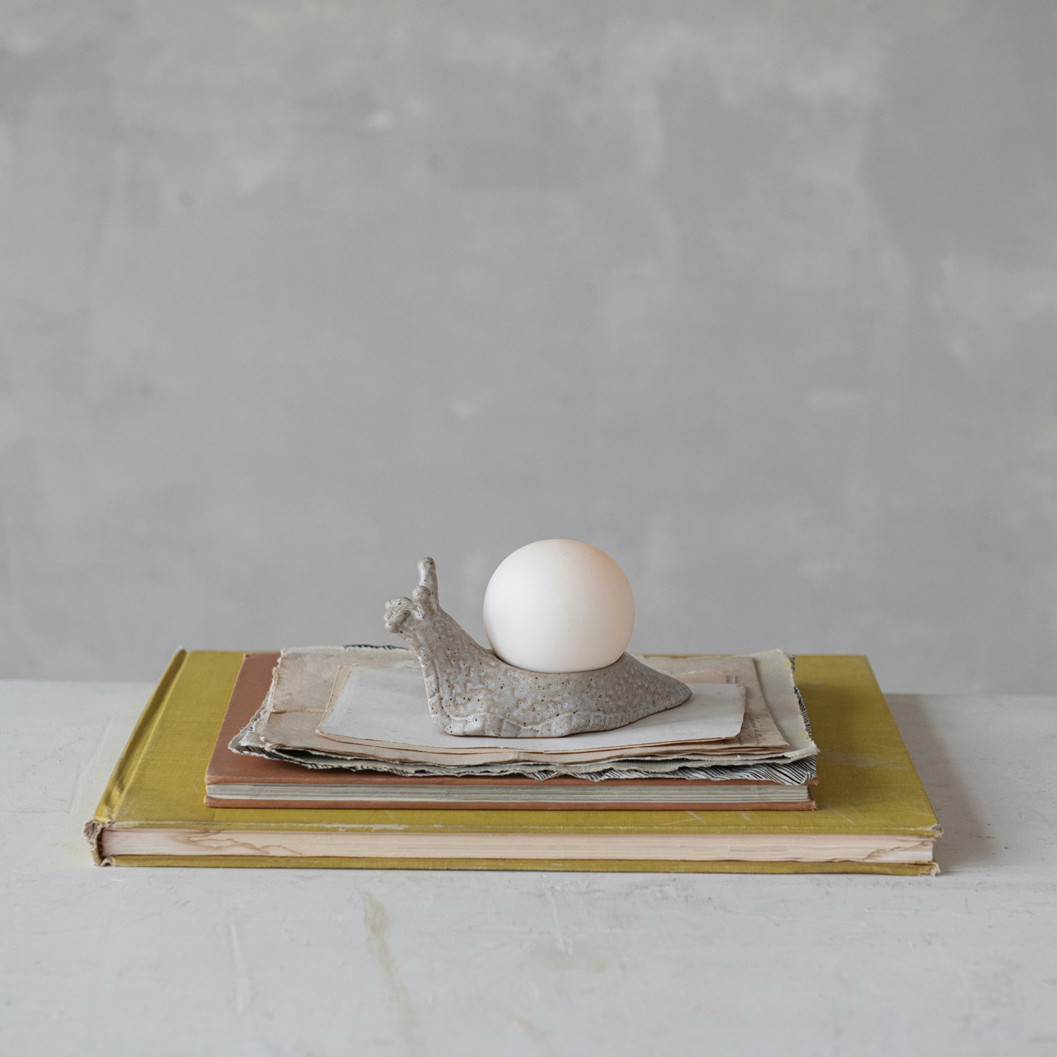 Catalog Name: 6"L x 3"W x 3"H Stoneware LED Orb Light w/ Snail Shaped Holder, Reactive Glaze, Cream Color Speckled, Set of 2 (Batteries Included) (Each One Will Vary)