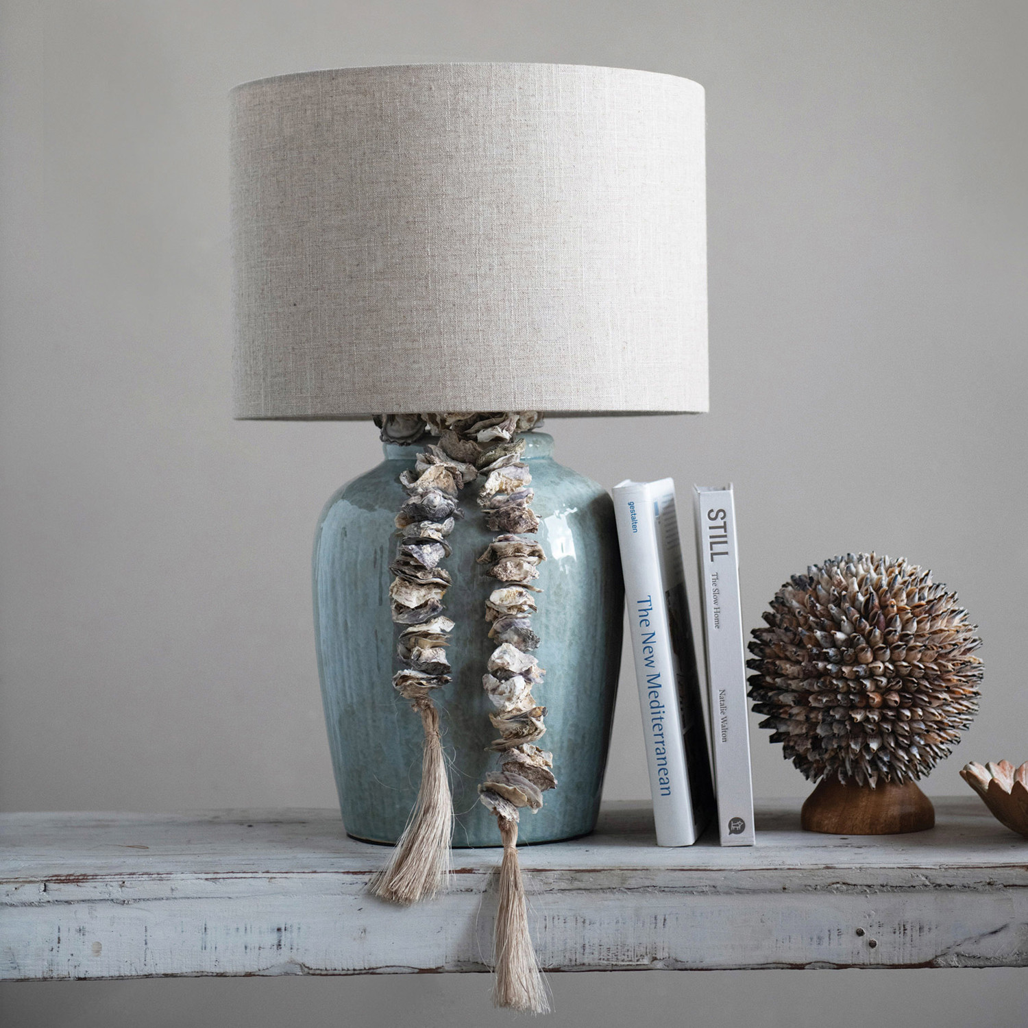 Add some style and personality to the space with this aqua stoneware table lamp that showcases an aqua stoneware base with a naturally variating reactive glaze, topped with an ivory linen shade. This table lamp is a beautiful and coastal-inspired addition to the home decor, as it features a stoneware base that has a round shape and an aqua reactive glaze that creates a stunning and unique effect. The aqua reactive glaze adds a touch of color and shine to the lamp, while the ivory linen shade creates a cozy and inviting light that complements the aqua base. This table lamp is suitable for any room that needs some extra freshness and brightness, such as the living room, bedroom, office, or any other area. It can also be a great gift for anyone who loves coastal, beach, or nautical design. This table lamp requires one 60-watt bulb (not included) and is equipped with a push-through switch for easy on and off. It measures 17 inches round x 25.25 inches tall, and the cord length is 5 feet. Add this aqua stoneware table lamp to the home and enjoy its beauty and functionality.