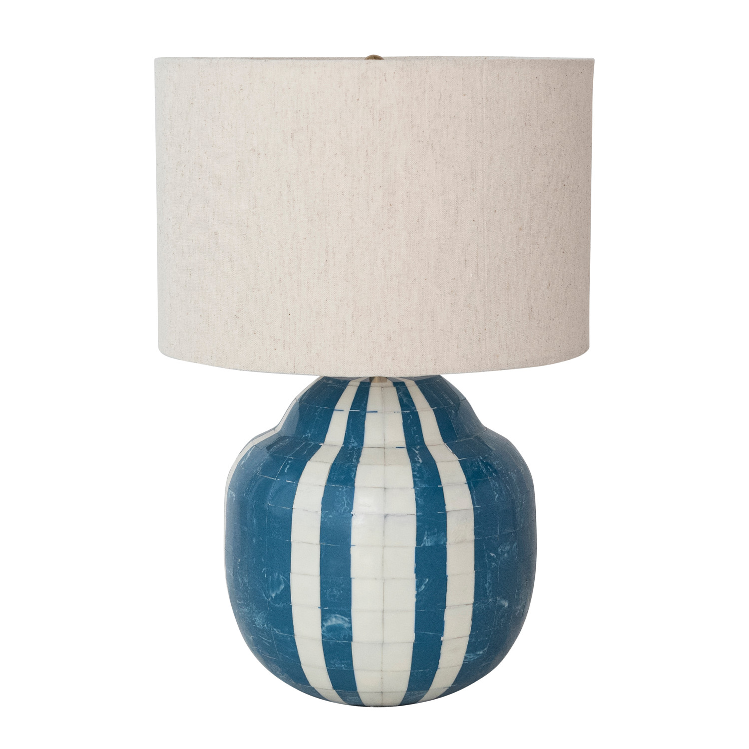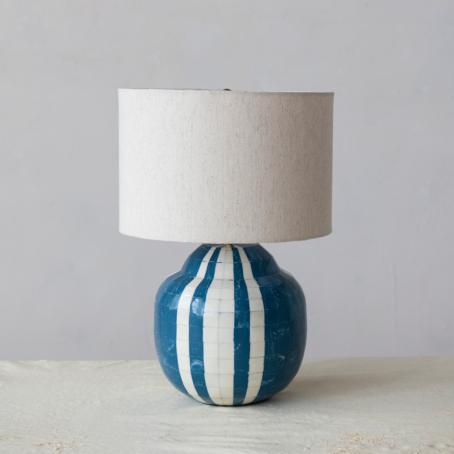 Catalog Name: 12" Round x 18"H Marbled Inlaid Resin Table Lamp w/ Stripes & Linen Shade, Blue & White
