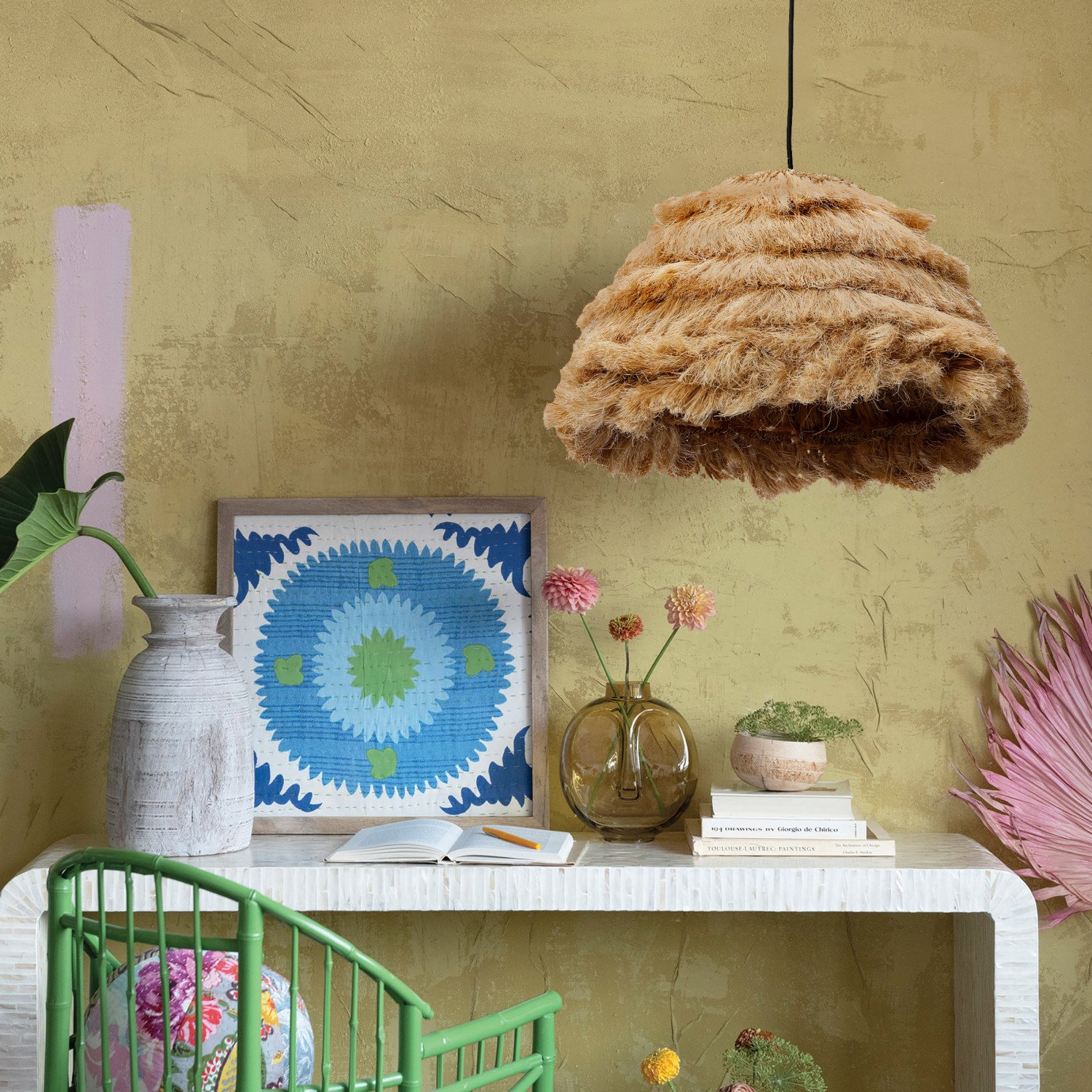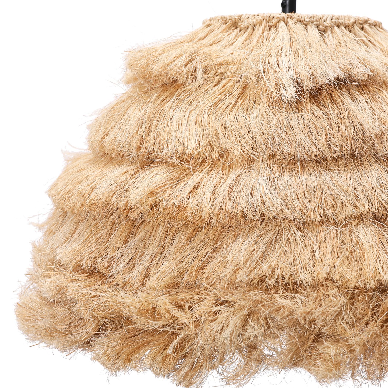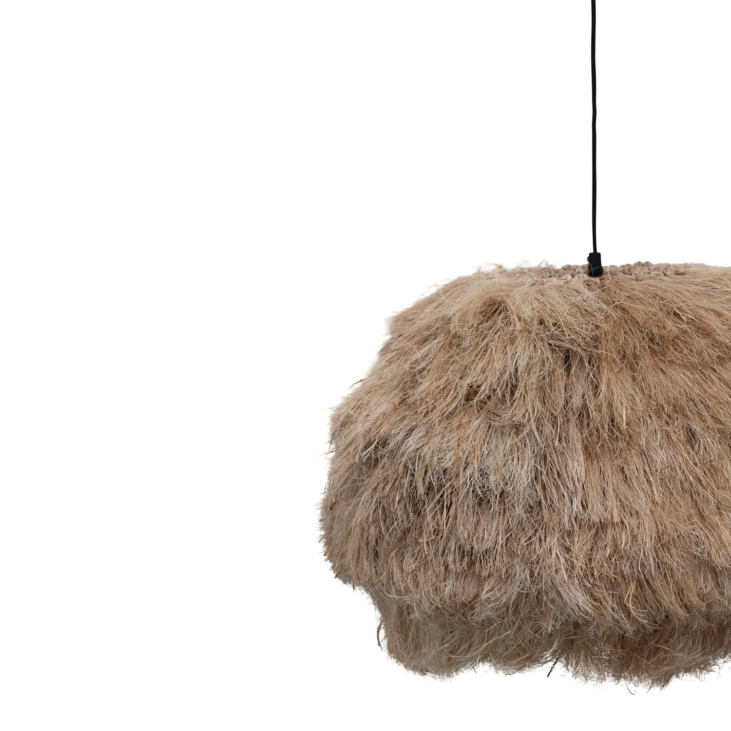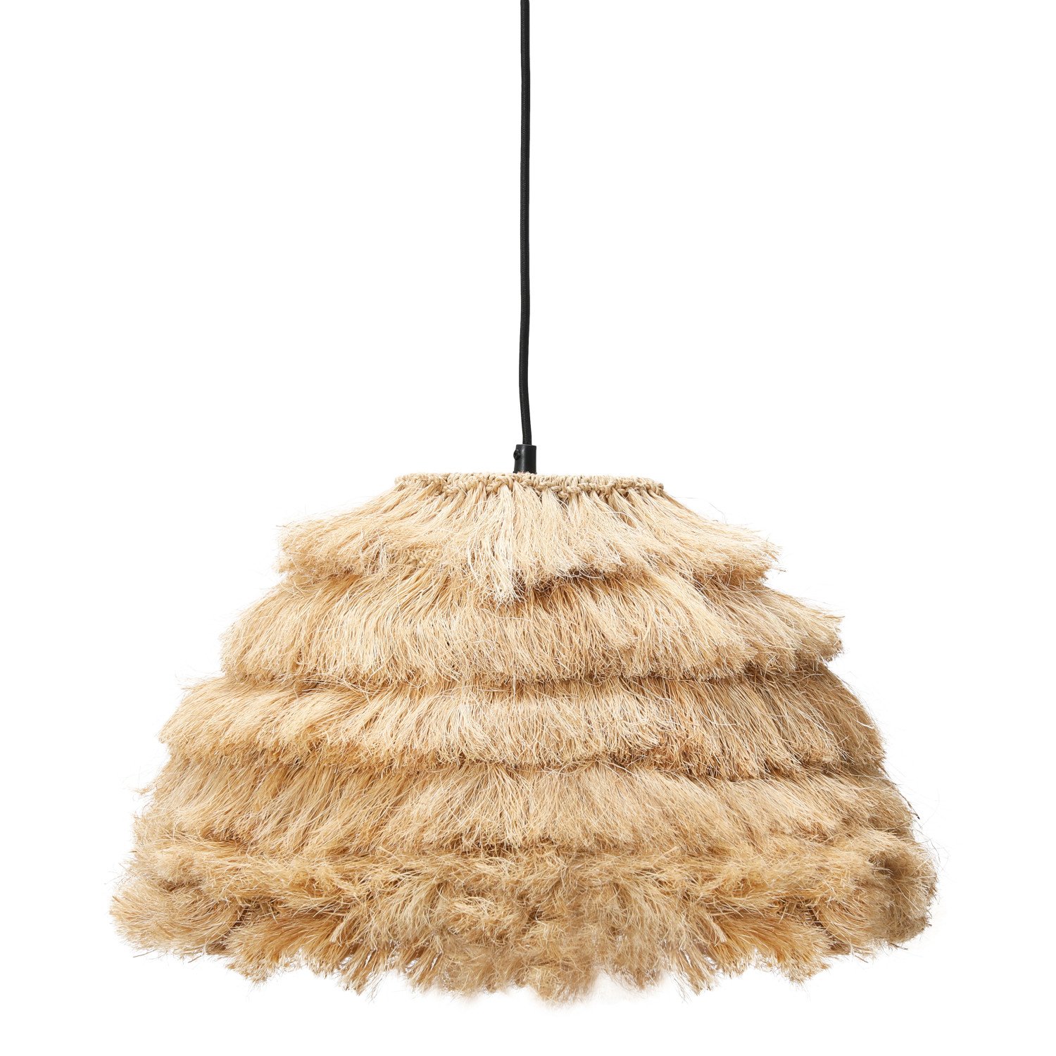 This contemporary, boho-inspired ceiling light showcases an iron base adorned with a fashionable, shaggy shade crafted from all-natural fiber. Natural abaca rope ceiling light with 4' cord. Display this stunning light fixture to instantly elevate any bedroom or gathering space. Maximum 60-watt bulb (not included).