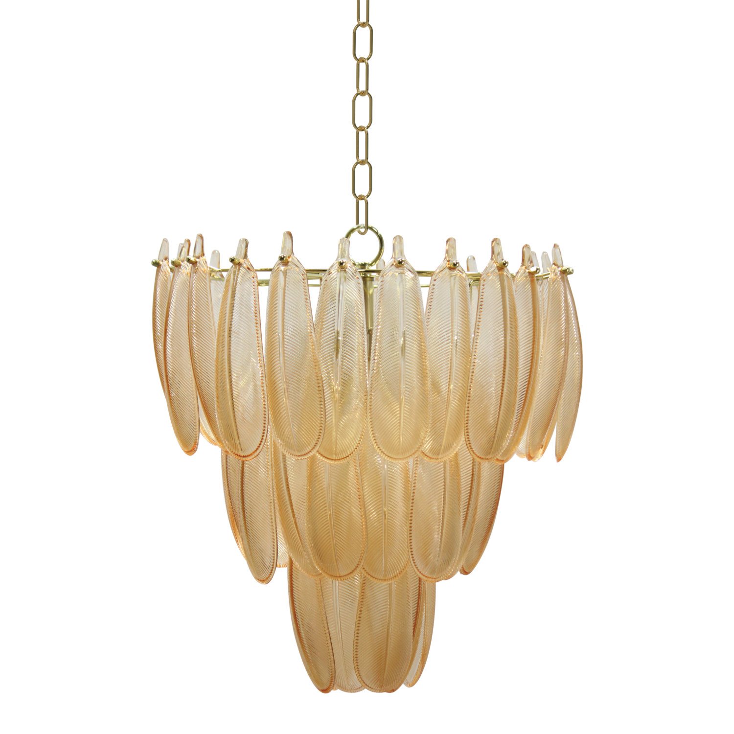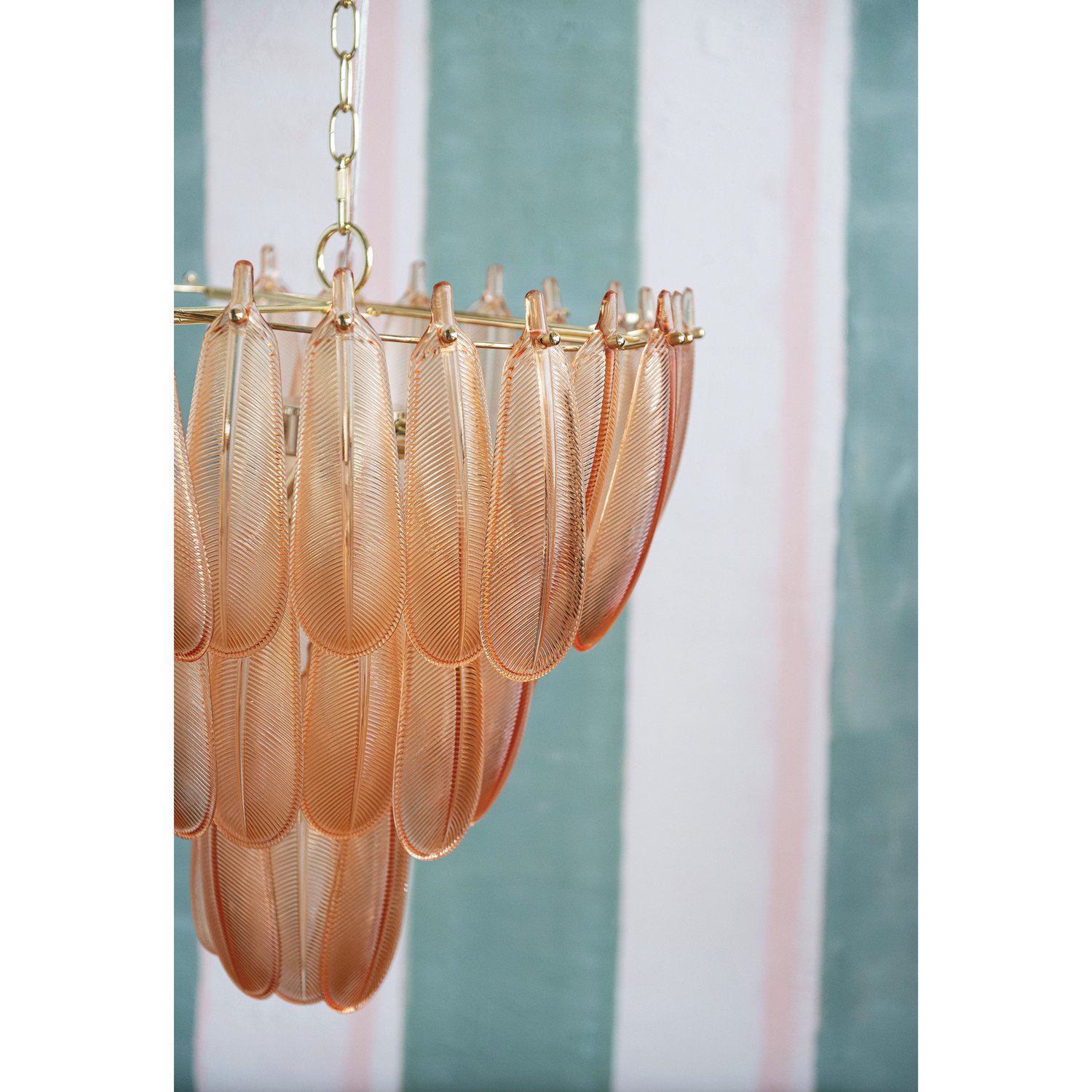 Catalog Name: 21" Round x 19-1/2"H Metal & Hanging Feather Shaped Glass Chandelier, 7 Lights, 6' Chain & 10' Cord, Gold Finish & Blush Color, KD (Hardwire Only)