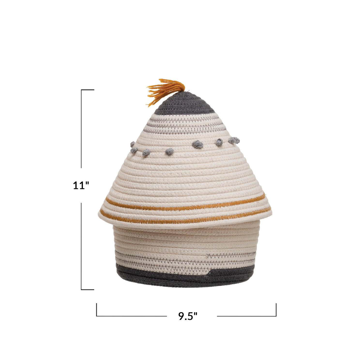 Catalog Name: 9-1/2" Round x 11"H Cotton Rope Basket w/ Lid & Embroidery, Grey & Mustard Color