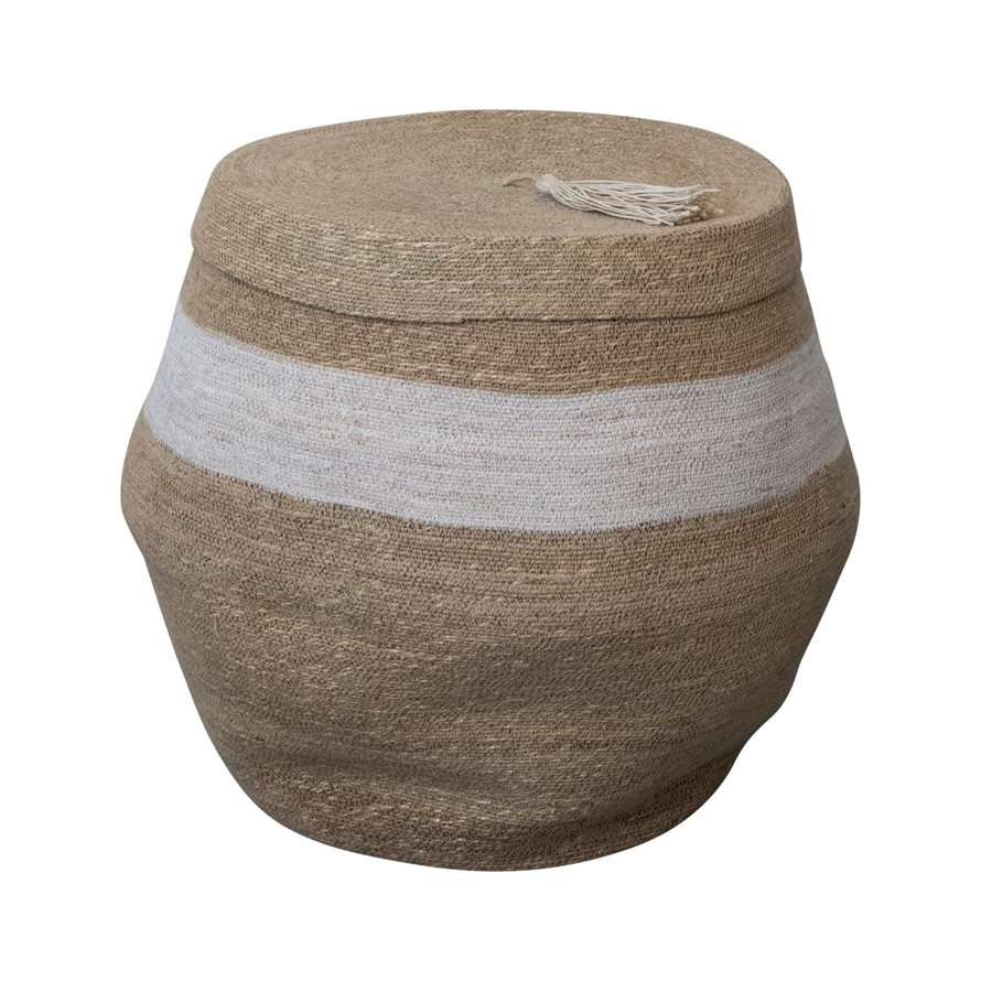 Catalog Name: 21-1/2" Round x 21-1/2"H & 15" Round x 17"H Woven Seagrass Baskets w/ (1) Lid & Tassel, Natural & White, Set of 2