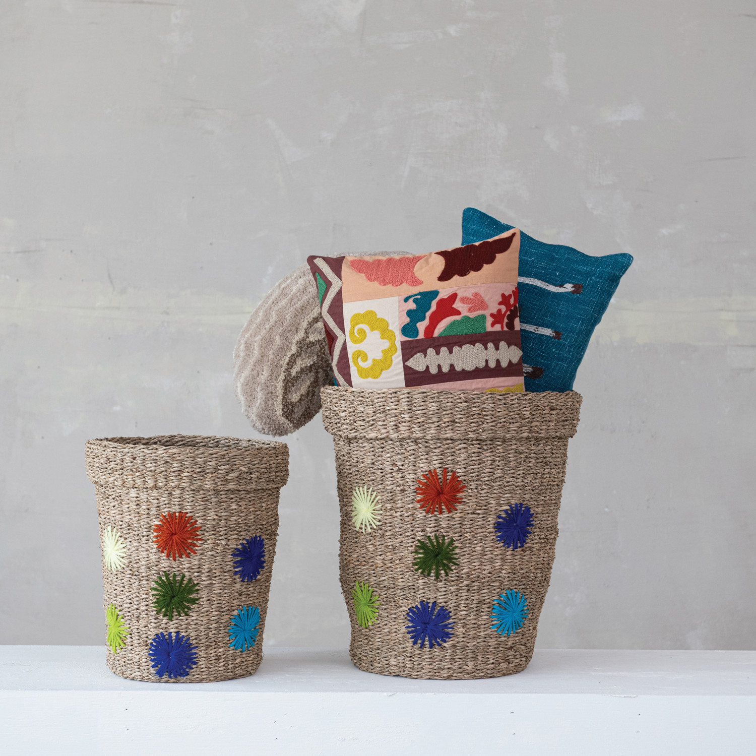Catalog Name: 16" Round x 17-1/2"H & 12" Round x 15"H Hand-Woven Seagrass & Wool Baskets w/ Embroidered Flowers, Multi Color & Natural, Set of 2