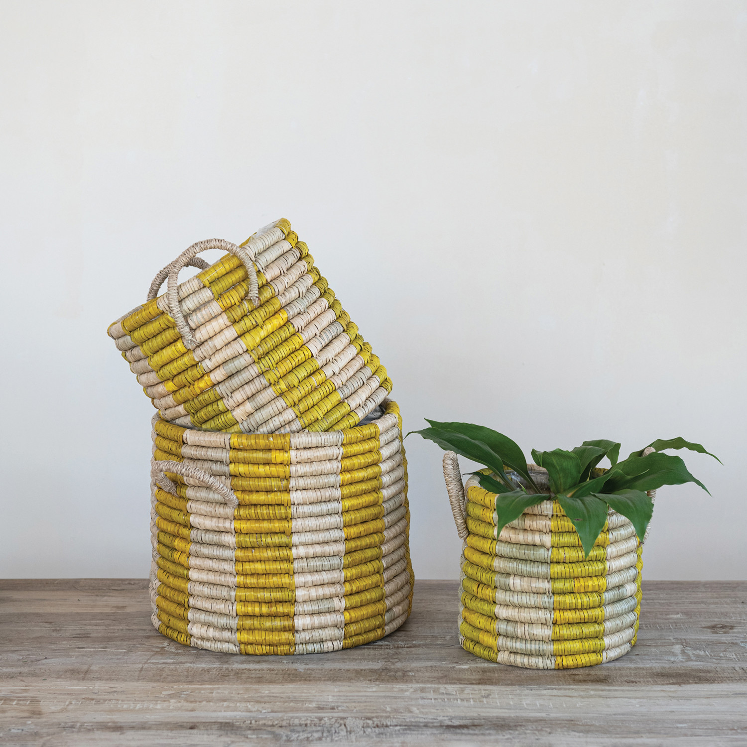 Catalog Name: 13" Round x 12"H, 11" Round x 11"H & 9" Round x 8-1/2"H Hand-Woven Seagrass Striped Baskets w/ Handles & Plastic Liners, Natural & Yellow, Set of 3