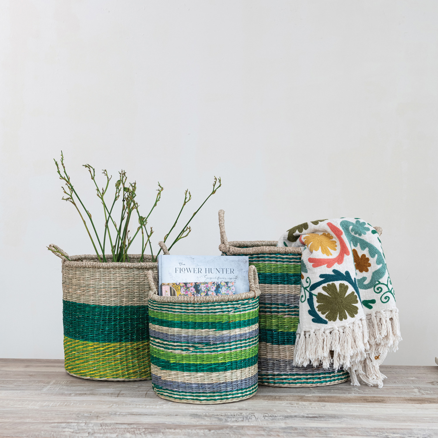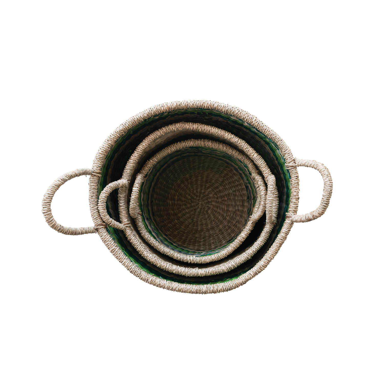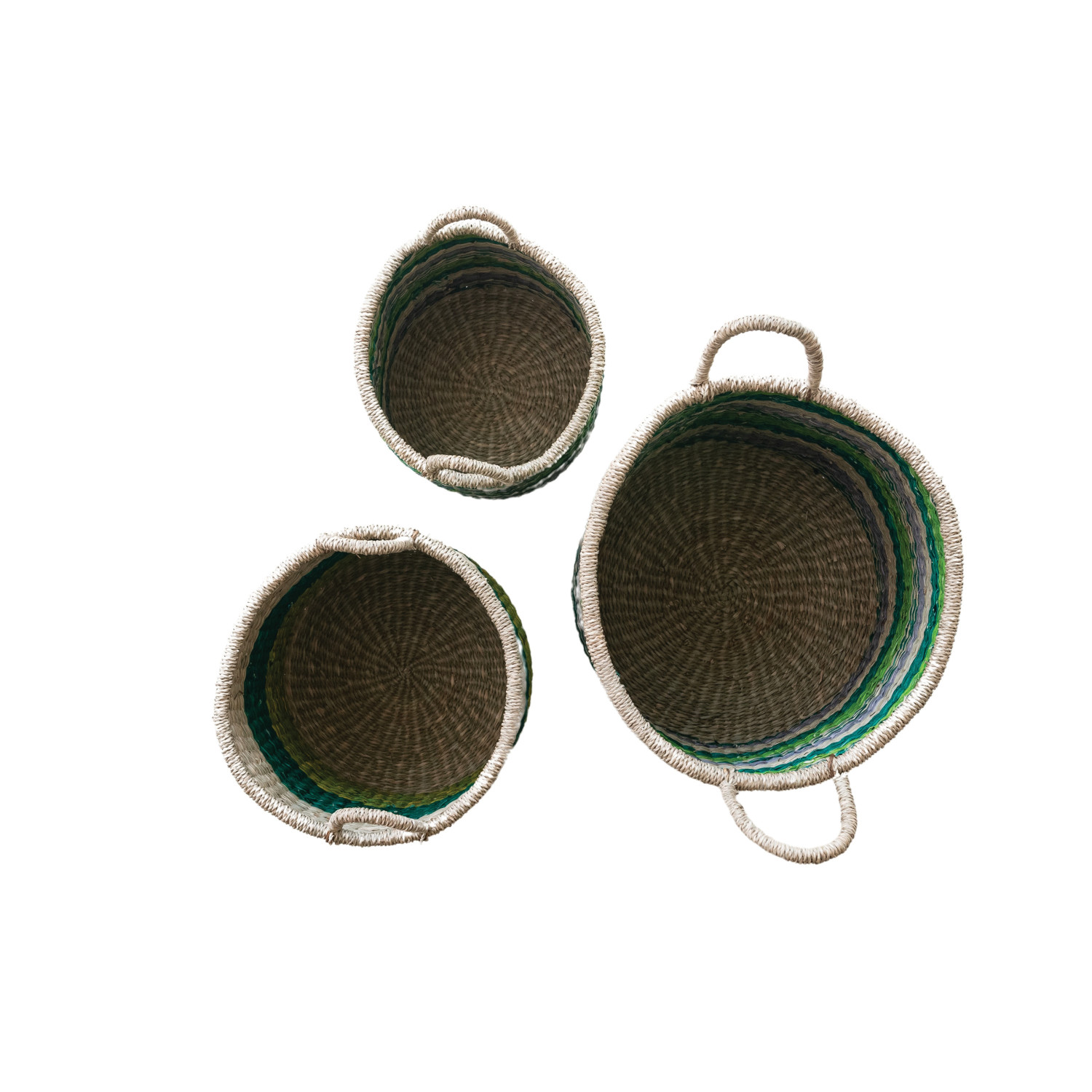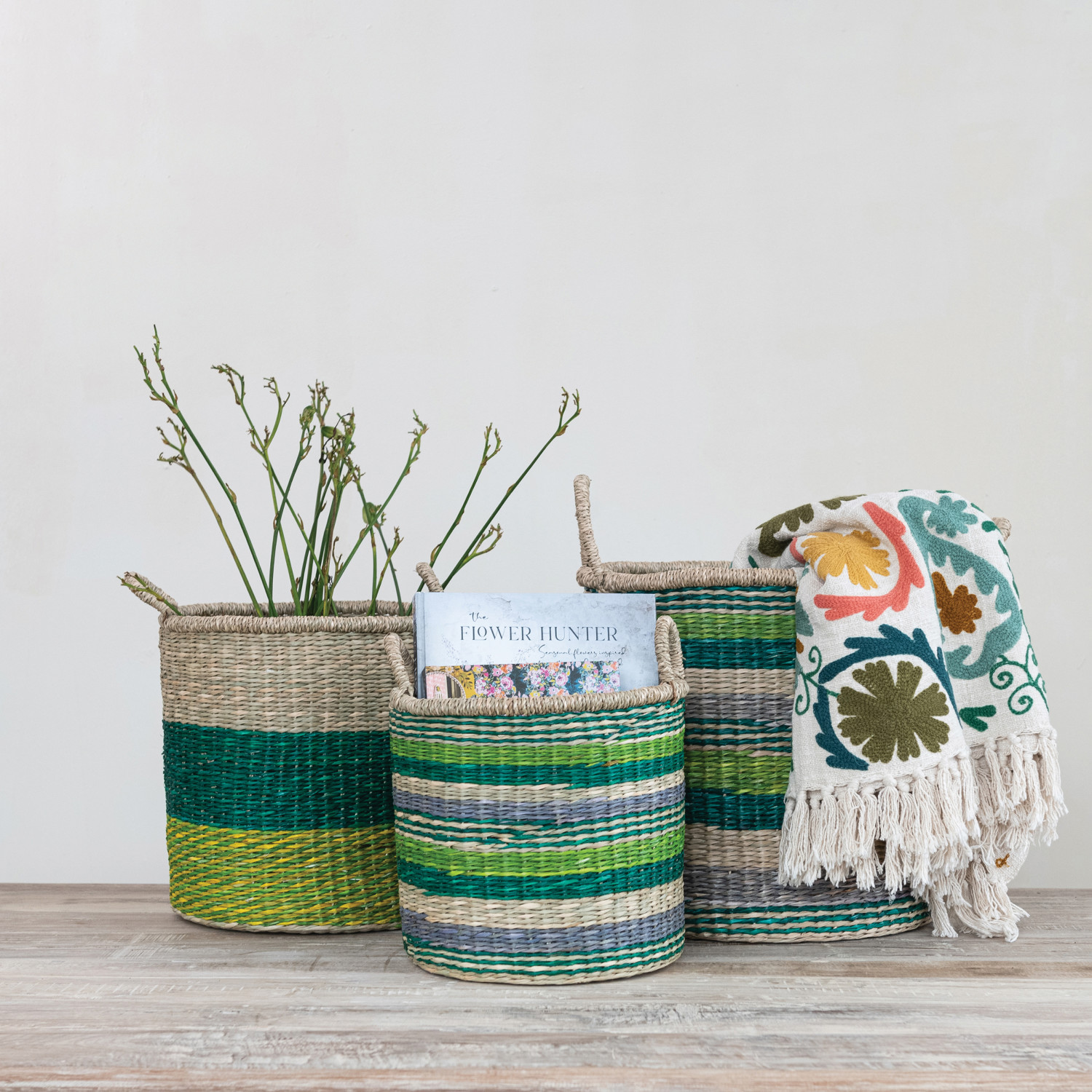 Hand-Woven Seagrass Striped Baskets with Handles, Set of 3