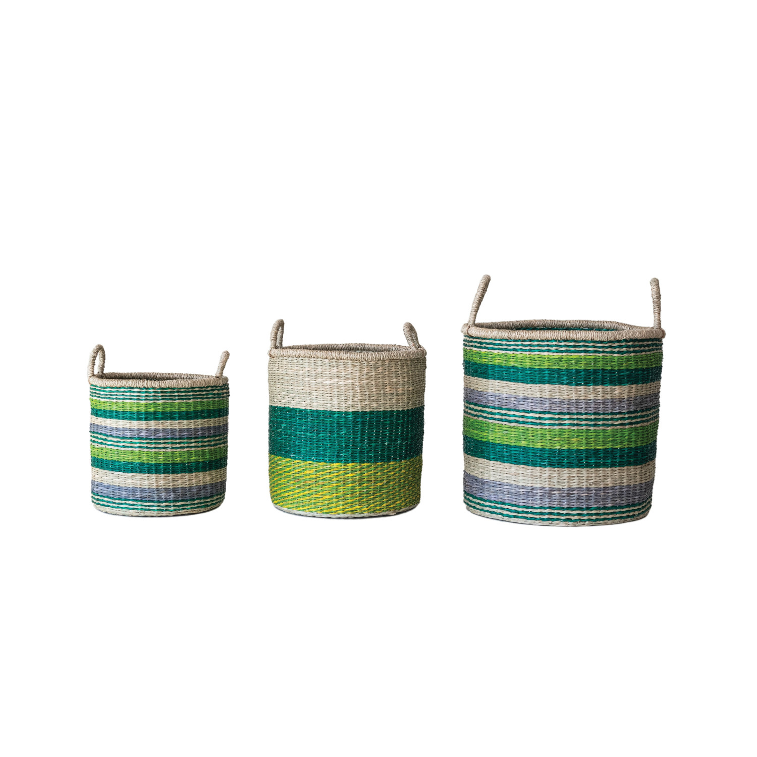 Catalog Name: 14" Round x 14"H, 12" Round x 12"H & 10-3/4" Round x 10"H Hand-Woven Seagrass Striped Baskets w/ Handles, Multi Color, Set of 3