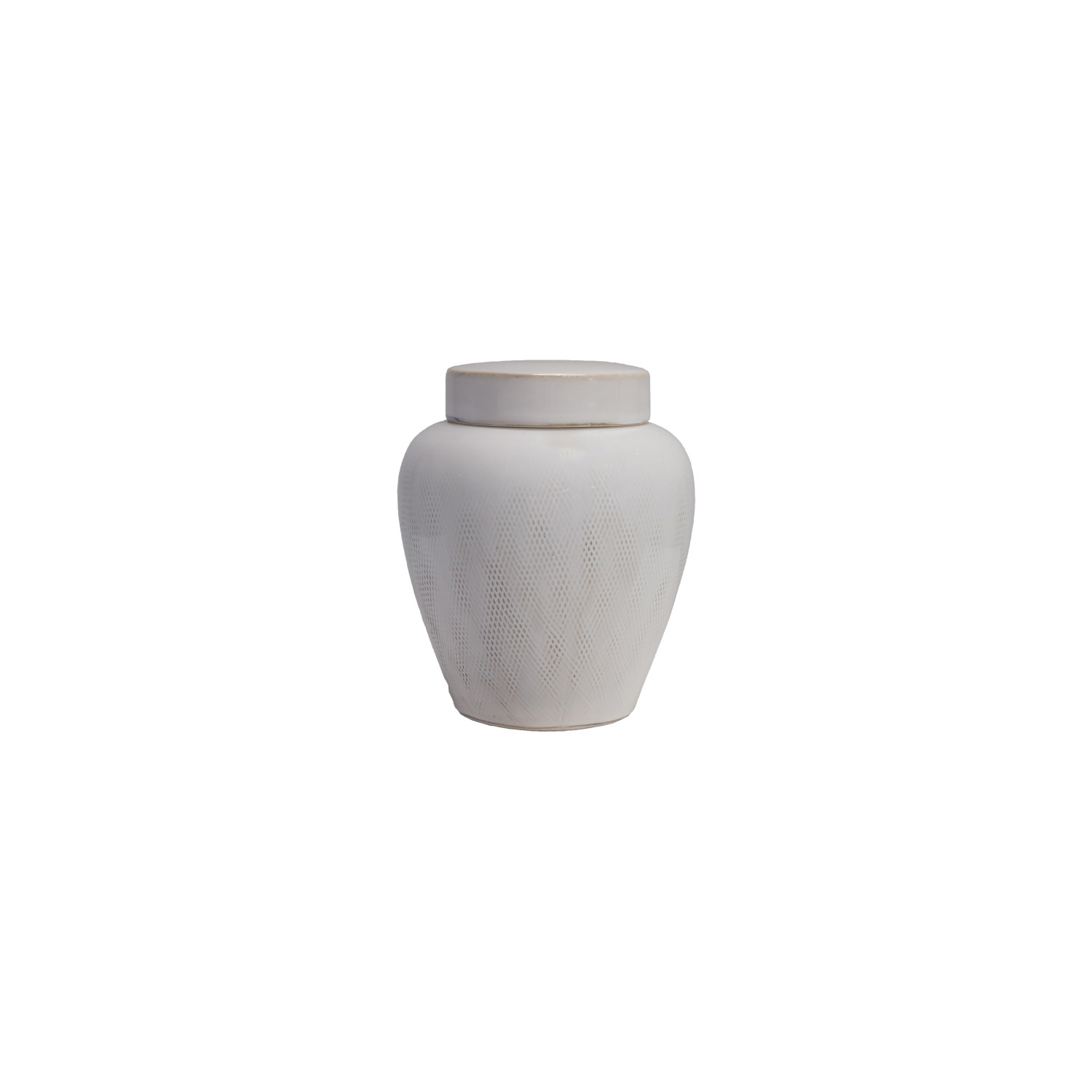 Catalog Name: 6-1/2" Round x 7-3/4"H Decorative Debossed Stoneware Ginger Jar w/ Linen Texture & Lid, Reactive Glaze, White (Each One Will Vary)